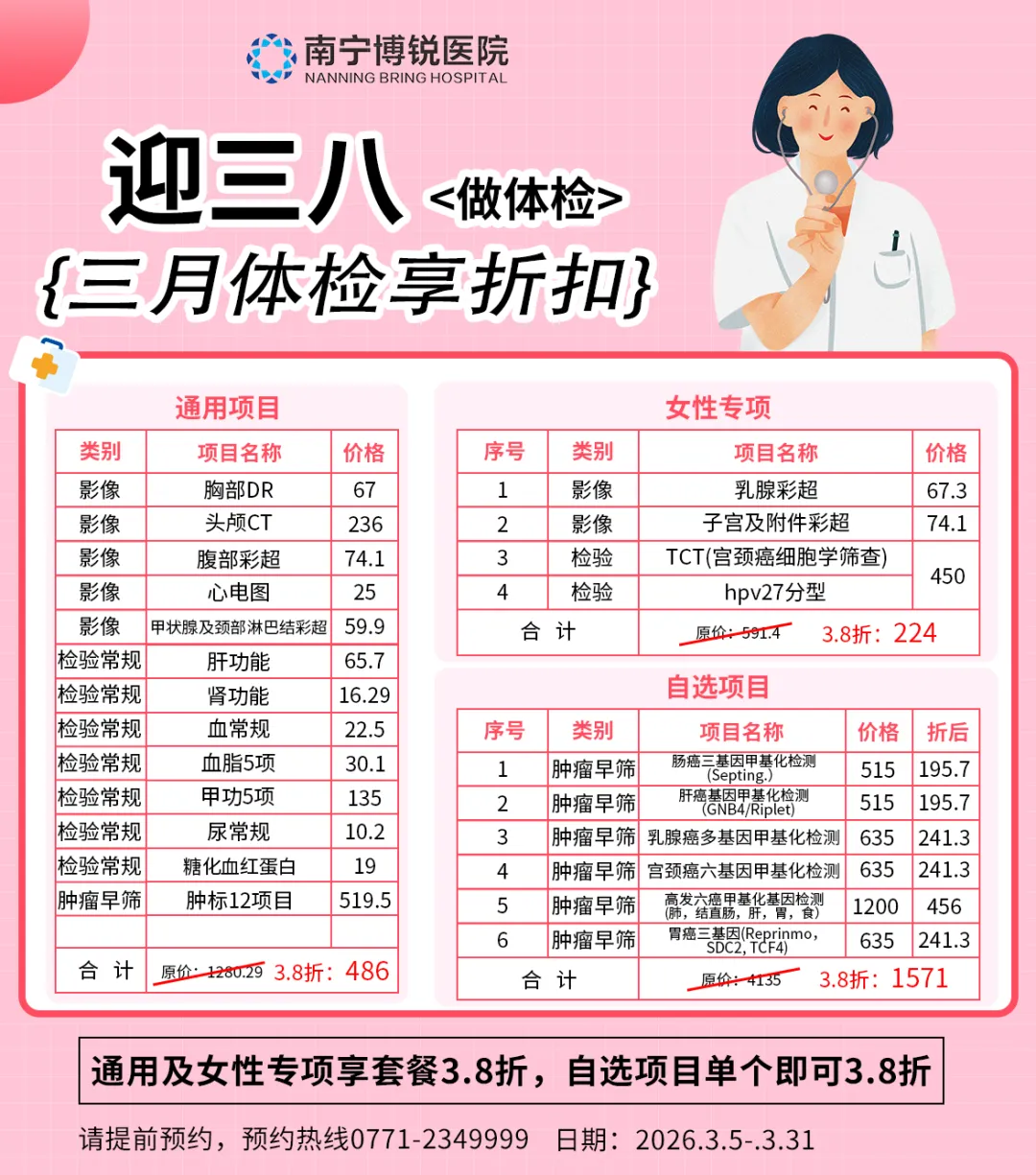 值此第116个“三八”国际妇女节之际,南宁博锐医院特别推出妇女节专属体检优惠活动,涵盖常规检查、妇科检查、肿瘤早筛等多个领域,让每一位女性都能在这个春天,绽放属于自己的健康光彩!