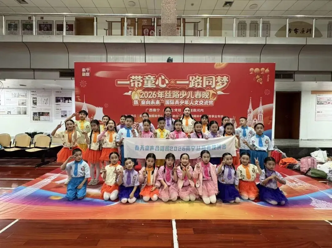 当北部湾的暖风遇见湄公河的晨光,咱们春天童声合唱团的小天使们,再次站上高光舞台——南宁融媒体中心2026丝路少儿春晚的聚光灯下,与两位老挝小哥哥小姐姐并肩开唱!
