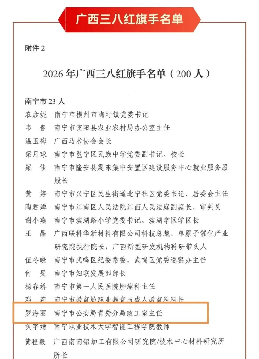 近日,自治区妇联决定,授予蒋三努等10人广西三八红旗手标兵称号,授予农彦妮等200人广西三八红旗手称号,授予南宁市良庆区良庆镇宋厢社区居民委员会等100个单位广西三八红旗集体称号。南宁市公安局罗海丽被授予广西三八红旗手称号。