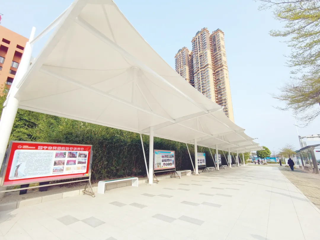 在南宁市天桃实验学校翠竹校区门外的家长等候区,崭新的白色顶棚格外引人注目。这处面积达600平方米的等候区,最多可同时容纳600名家长。等候区顶棚采用多层结构膜材设计,兼具隔音降噪、夏季隔热、冬季保温功能,为接送孩子的家长遮风避雨、提供舒适等候空间。