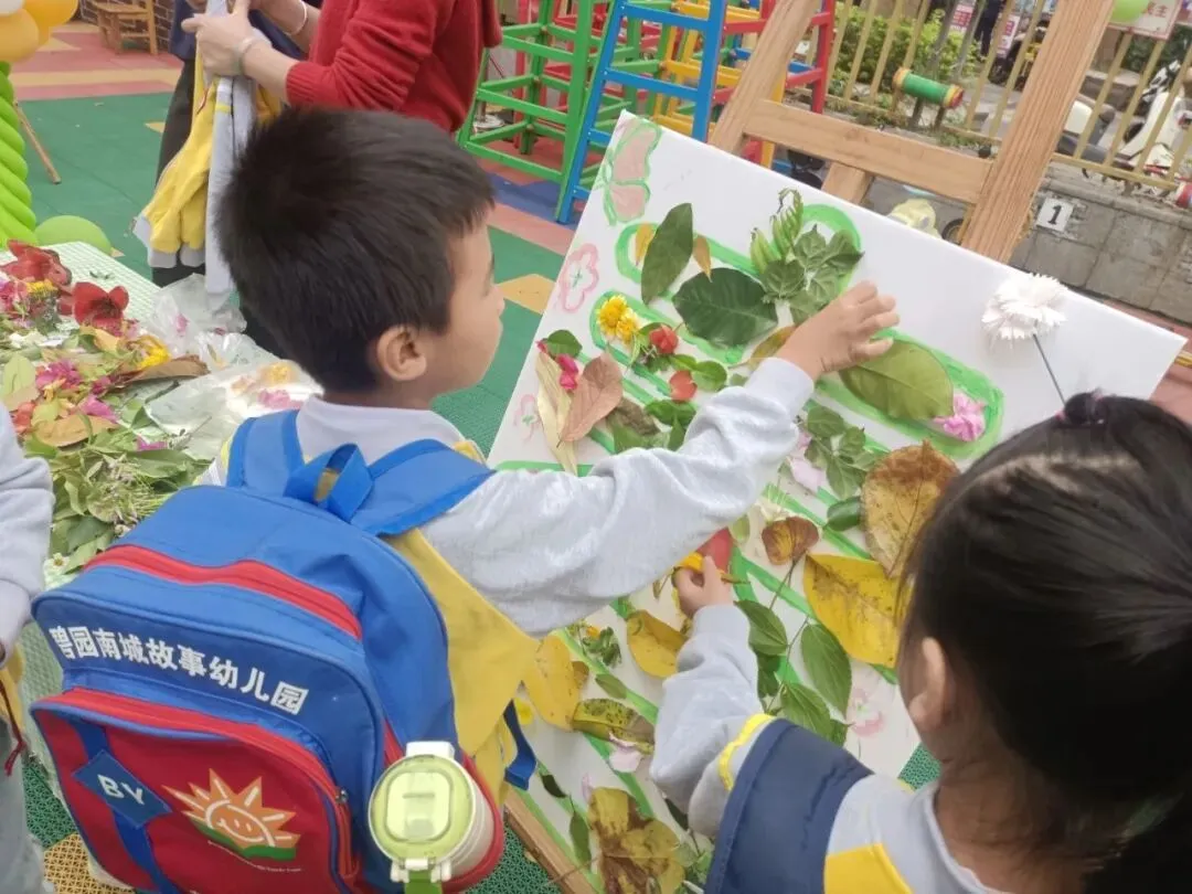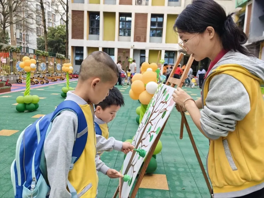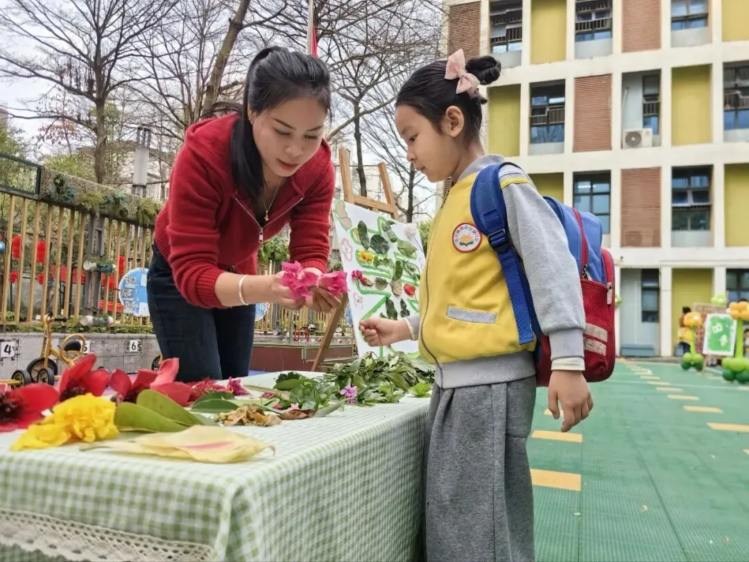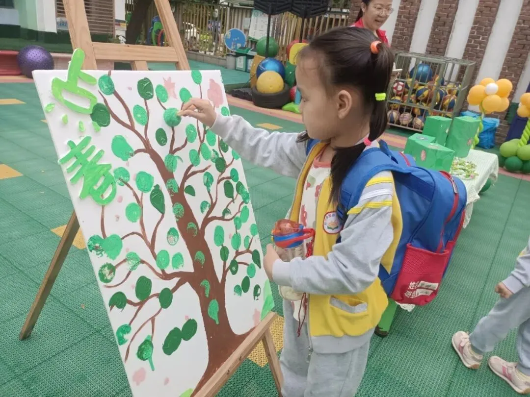 在“点春”活动区,孩子们化身小小艺术家,用画笔和自然材料描绘春天。有的用拓印的方式为大树添上嫩绿的叶子,有的则用收集来的花瓣和树叶拼贴出五彩的画作。在老师的引导下,孩子们用自己的方式感知春天、拥抱自然。