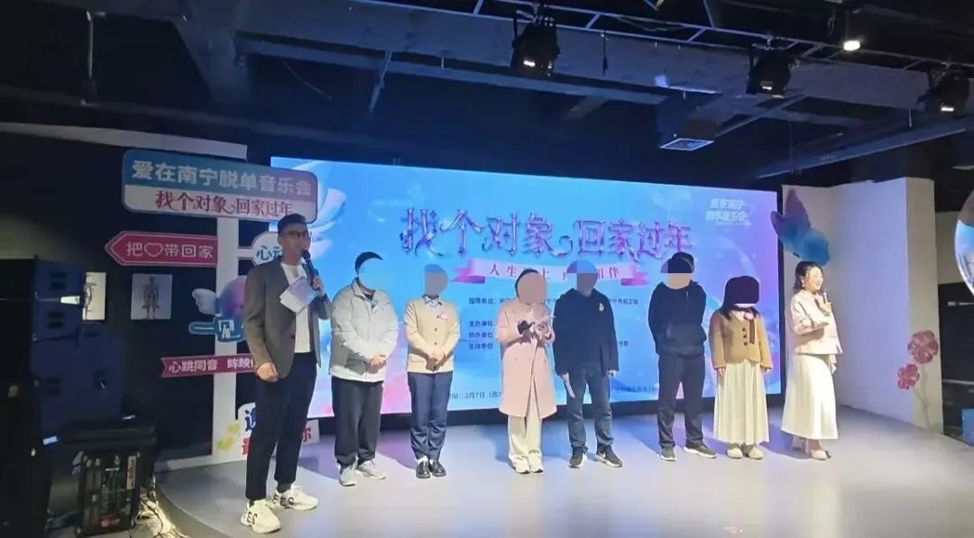 2月7日,由南宁市融媒体中心主办,南宁百货大楼股份有限公司协办,南百家电、宋厢社区相亲相爱红娘工作室承办的“爱在南宁·脱单音乐会——找个对象回家过年”主题活动,在南宁百货大楼朝阳店南楼4楼温情启幕。本次活动得到了南宁市民政局、南宁市文旅局、南宁市总工会、共青团南宁市委员会、南宁市妇女联合会的大力指导,广西芊禧红娘婚姻服务有限公司公益红娘全程提供专业服务。