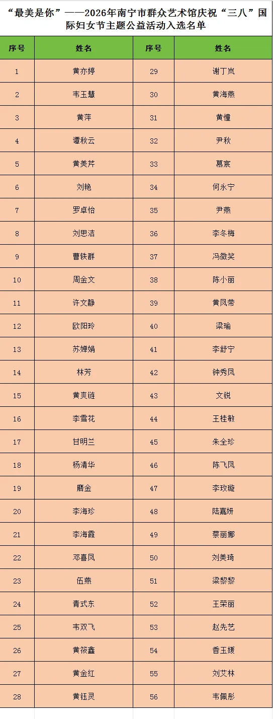 “最美是你”——2026年南宁市群众艺术馆庆祝“三八”国际妇女节主题公益活动征集入选名单公布