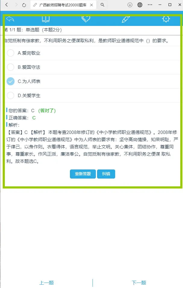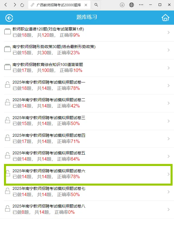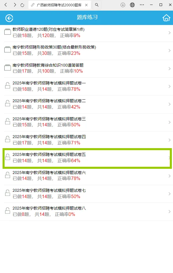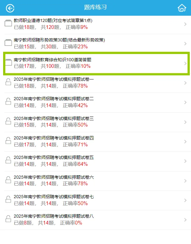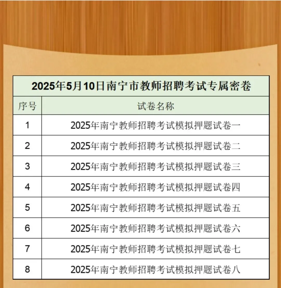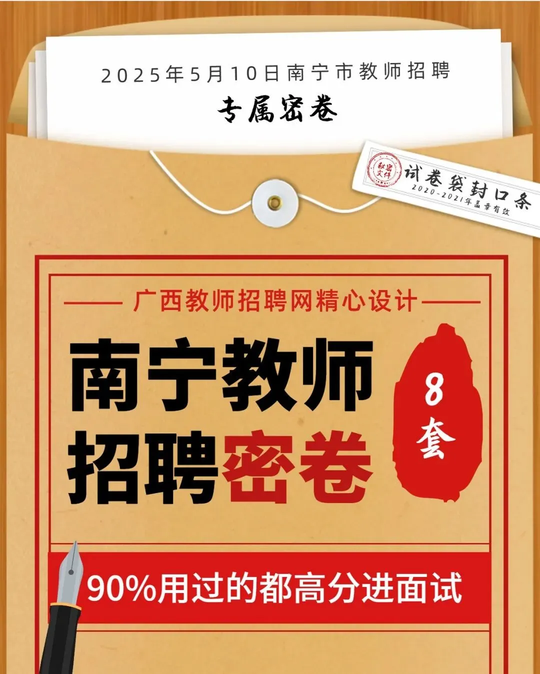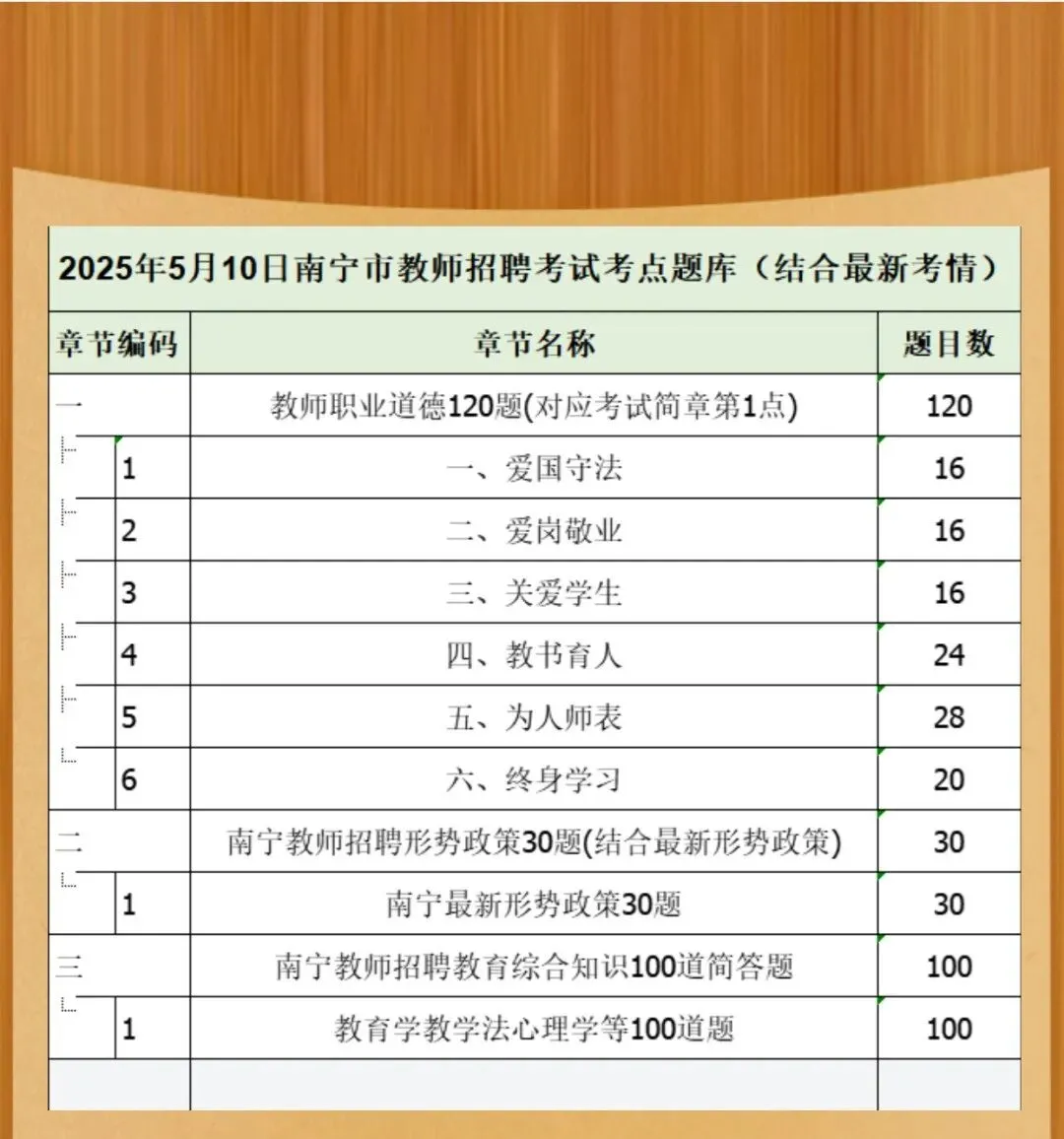 南宁教师招聘题库更新:除了8套试卷外,新增教师职业道德考点试题120题!南宁教师最新形势政策考点试题30题!结合新考情研发!助您备战5月10日!2025年南宁市中小学教师招聘,5月10日(星期六)上午10:00—11:30笔试,笔试内容为:职业道德以及岗位所需的专业知识、技能的掌握和运用能力,共一科,满分100分。