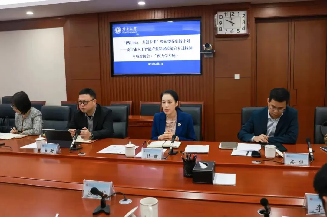 3月3日,南宁市外事办公室党组书记、主任彭健率队赴广西大学开展“智汇南A·共创未来”暨东盟谷引智计划——人工智能产业发展政策宣介进校园专场活动。彭健一行拜会了校党委书记李国忠,双方围绕合作意向进行交流,并与校党委常委、副校长梁恩维进行主题座谈。
