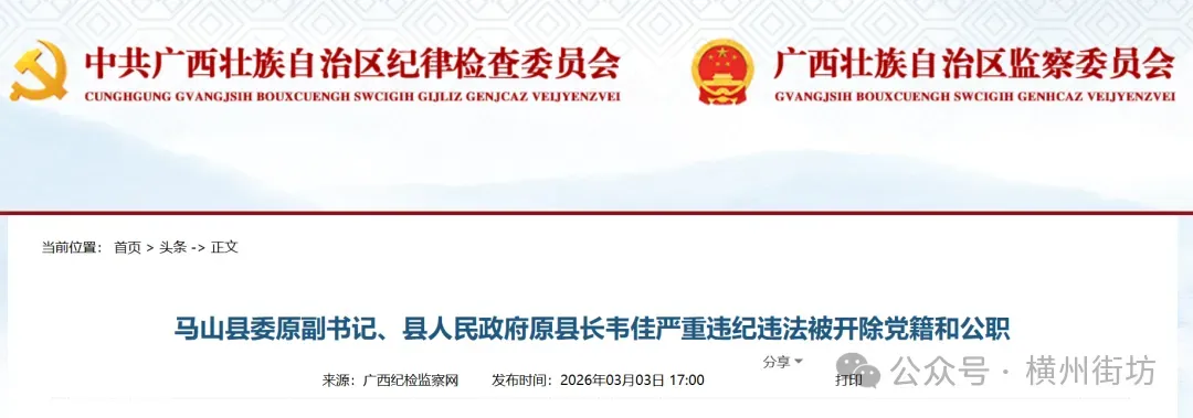 经自治区党委批准,自治区纪委监委对马山县委原副书记、县人民政府原县长韦佳严重违纪违法问题进行了立案审查调查。