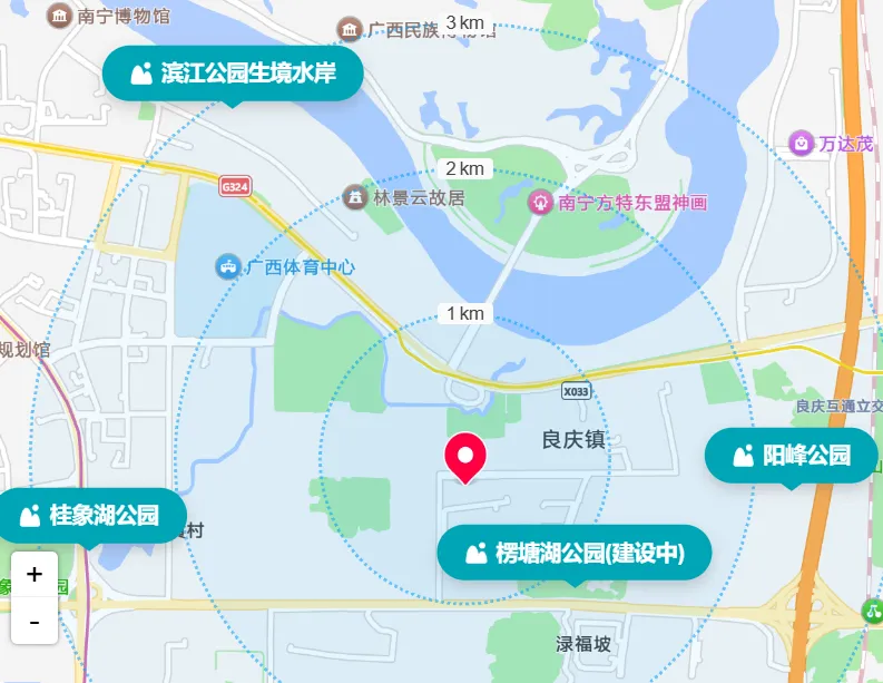 近享楞塘湖公园、五象湖公园、五象滨江公园等城市绿肺,远眺青秀山风景区,湖景与园景交织,茶余饭后散步休闲、亲子游乐皆有好去处,居住环境舒适宜人。1公里直达良庆大桥南岸邕江边,大桥过去就是方特东盟神话。