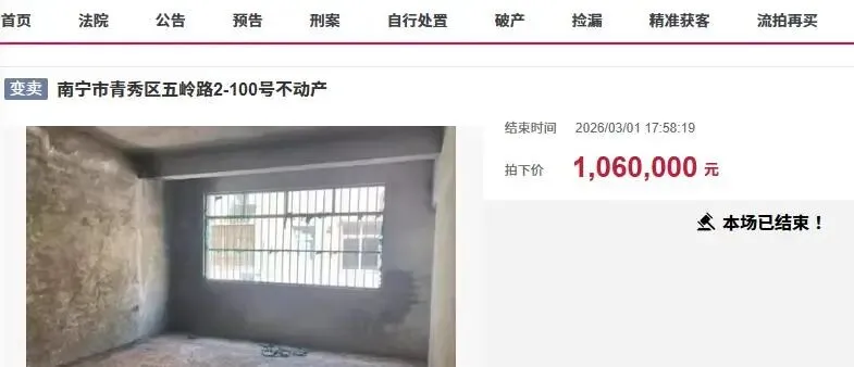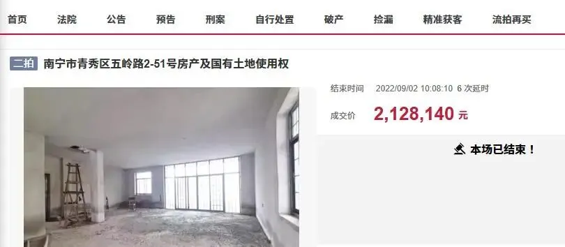 近日,在阿里拍卖上,南宁市迎来了一宗起拍价比较低的房产拍卖,一宗位于南宁市青秀区五岭路2-100号不动产再次被拍卖。此次拍卖的是一栋私人自建房,房子宗地面积有107.31平方米,占地面积不小,建筑面积为369.24平方米,应该是三层的私人楼。房子现在还是毛坯房状态,并没有装修入住。