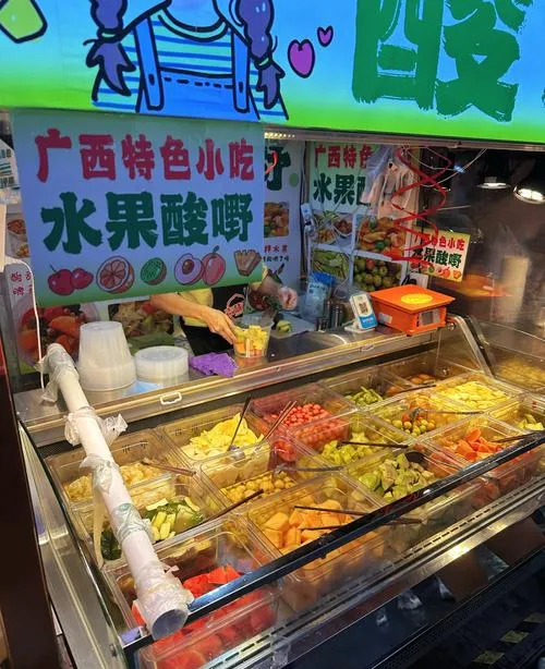 酸嘢这个东西,你要说它饱腹感,肯定比不上烧腊,但南宁人要的不是饱腹感,是那个酸爽的刺激,那个刺激的作用是什么呢,是把人的注意力从白天的劳累里拉出来,让你重新感觉到"我还活着,我还能感受到味道,我还有时间浪费",所以南宁的夜宵文化,核心不是补偿,是释放,释放掉那些被规训的紧张感。