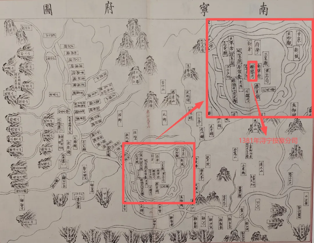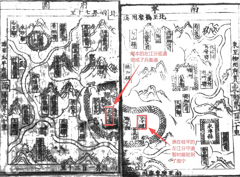 到了明嘉靖十七年(1538)编撰的《南宁府志》,其中所收录的“南宁府境图”和“南宁府城图”里,就清晰明确的标注了“左江道”,此时距离1396年设置左江道已过去142年。作为按察司的派出机构,到了明代中期其地位已变得日益重要。图中在南宁府衙右侧的“察院”,全称“都察院”,是监察御史(简称“御史”)的公署,主要职能是监察百官。御史可直接对皇帝负责,独立弹劾各级违法违规的官员,与按察司是两个不同的监察系统。明代都察院在地方设有“十三道监察御史”,一省一道。