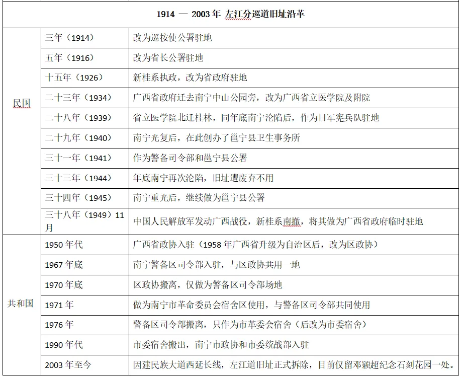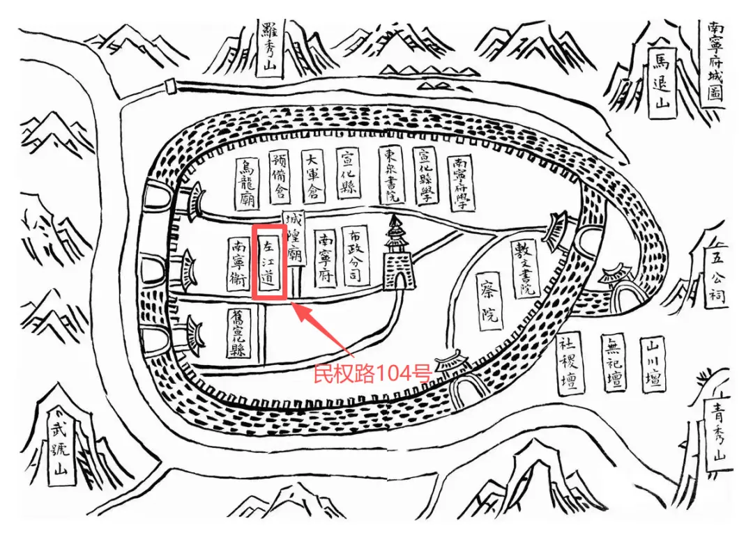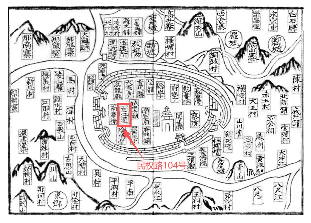 明洪武十四年(1381)设置的浔宁按察分司,是民权路104号可追溯的最早时间点。直至2003年南宁市为打通江北大道与民族大道,修建民族大道西延长线,而拆除了该旧址,左江道最后的遗存彻底消失在了大众的眼中。