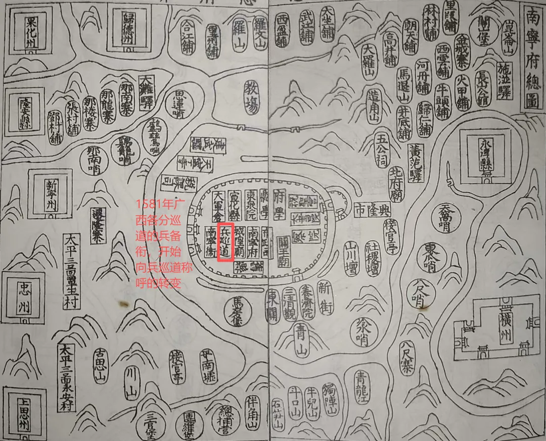 明万历三十年(1602)完成的《殿粤要纂》中绘制的“南宁府总图”,此时左江分巡道已迁回南宁,并升格为了“左江兵巡道”