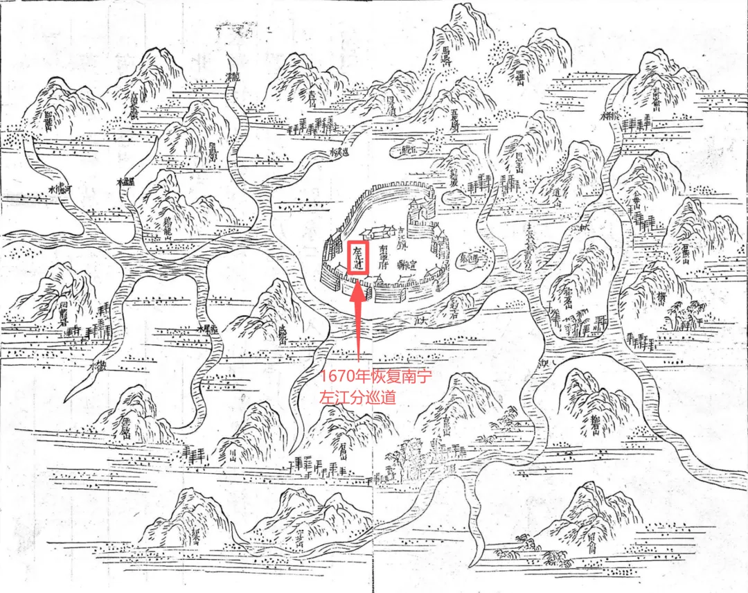 清康熙十三年(1674)版《南宁府志》绘制的“南宁府宣化县之图”。以及清康熙二十四年(1685)出版的《广西舆图·南宁府卷》中绘制的南宁府“宣化县图”,均标注了“左江道”,都在南宁府衙左侧。而这也符合笔者在前文第3节所写“三藩之乱”爆发前,1670年清廷重新恢复南宁的道级行政单位。