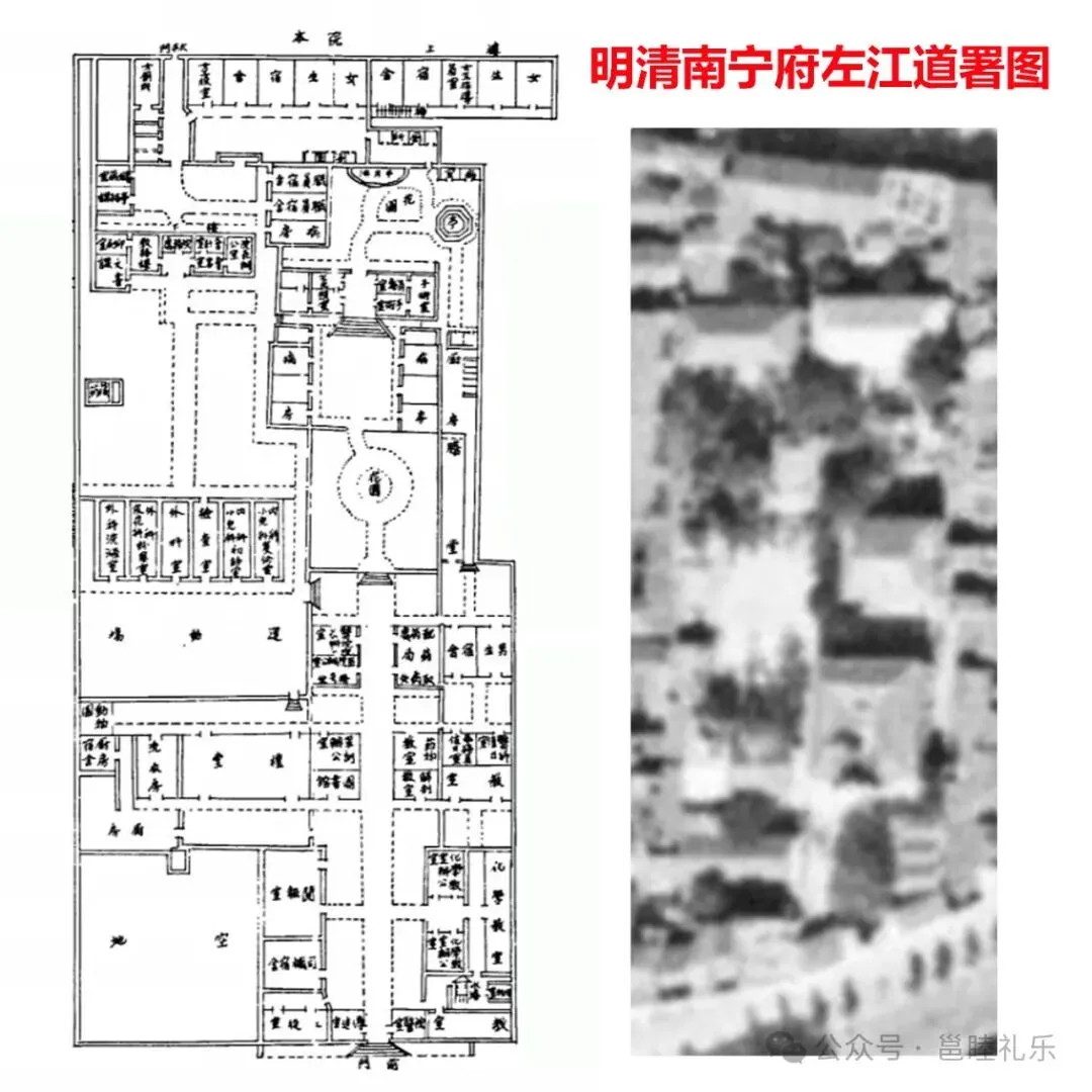 而这四所国内仅存的道署衙门,也让我们更清晰的看到了官府建筑的礼制布局,这为我们复原南宁左江道衙署的建筑分布,提供了参考与模板。结合《南宁府志》和《(民国)邕宁县志》对南宁左江道衙署的描绘,我们基本上能够较为清晰的了解到其内部的布局了。