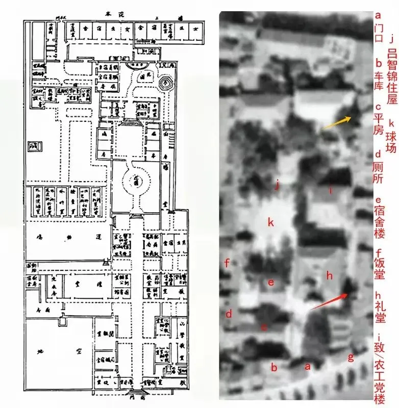 图中左侧为1934年左江道旧址作为“广西省立医学院”时的学校平面图,右侧为1973年南宁航拍图中的左江道旧址,此时其已作为“警备区司令部场地”。