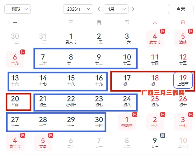 广西官宣2026年广西三月三放假通知后,有热心网友发现:整个4月份,广西人每周只用上4天班,周周享受小长假。