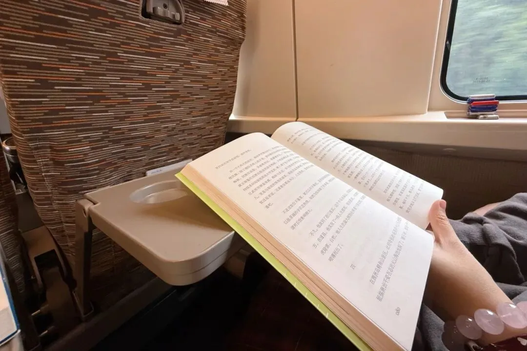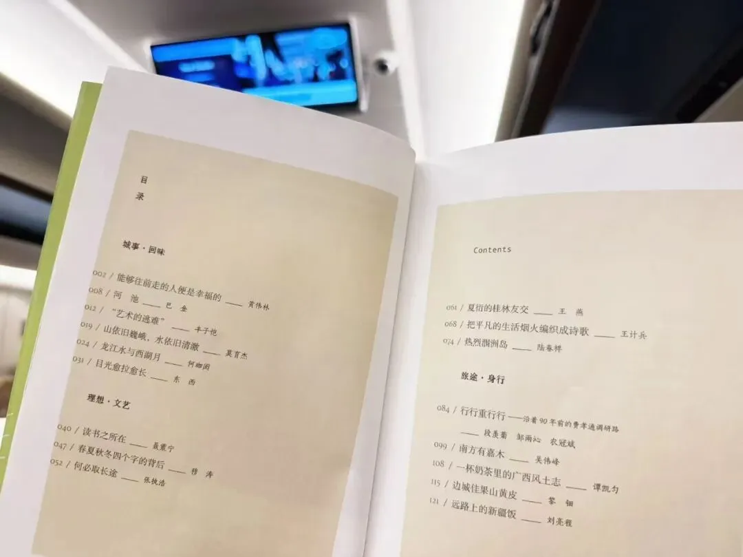 “没想到高铁上有赠阅的书籍。这书很应景,收录的都是和当地有关的文章,看了丰子恺、巴金先生的文章。可惜旅途只有一个小时,阅读了几篇就到站了,依依不舍地放回去,下次还坐南宁局的列车,继续看。”