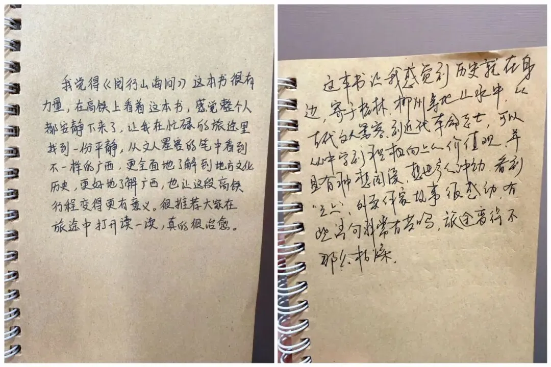 “这次旅行在第二辑《阅行山海间》上看到了自己的留言,又惊喜又感动。如果你此刻正在广西旅行,不妨翻翻前座网袋里的这本书,也许就能找到这份别出心裁的礼物。”