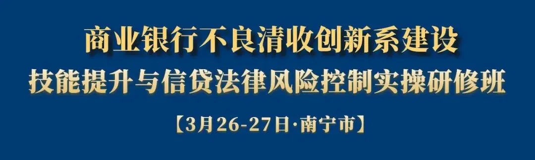 2026年的今天,越来越多的行社认识到,真正实现化险解困,必须标本兼治,要精心谋划顶层设计方案, 做足 2-3 年的统筹部署,搭建不良贷款高质量清收化解长效机制体系,让不良清收产生效益,才有助力银行高质量发展。同时,随着经济全球化和金融市场复杂性的增加,中小银行面临着前所未有的挑战。信贷业务作为银行的核心业务之一,其法律风险的防范和不良贷款的清收成为银行稳健经营的重要一环。为了提高中小银行在信贷领域的法律风险管理能力和不良贷款处置效率,为此佳信联合国内两位顶级的实战专家于2026年3月26-27日(25日报到)在南宁举办“破局不良、控新清旧-商业银行不良清收创新体系建设、技能提升与信贷法律风险控制实操研修班”。本次培训班旨在帮助中小银行深入了解和掌握信贷业务中的法律风险点,提升信贷审批、贷后管理和不良贷款处置的法律合规水平。同时,通过实战案例分析和模拟演练,提高员工在系统清收方面的实战能力,有效突破不良贷款清收的难点。