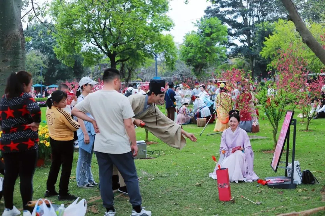 来自各地的国风爱好者齐聚桃林旁,身着各式传统汉服,以优雅的仪态、翩跹的才艺演绎千年礼仪,诠释华夏气韵。
