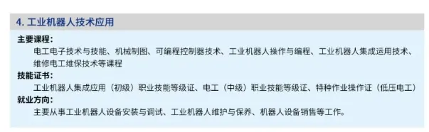 主要课程:电工电子技术与技能、机械制图、可编程控制器技术、工业机器人操作与编程、工业机器人集成运用技术、维修电工维保技术等课程技能证书: