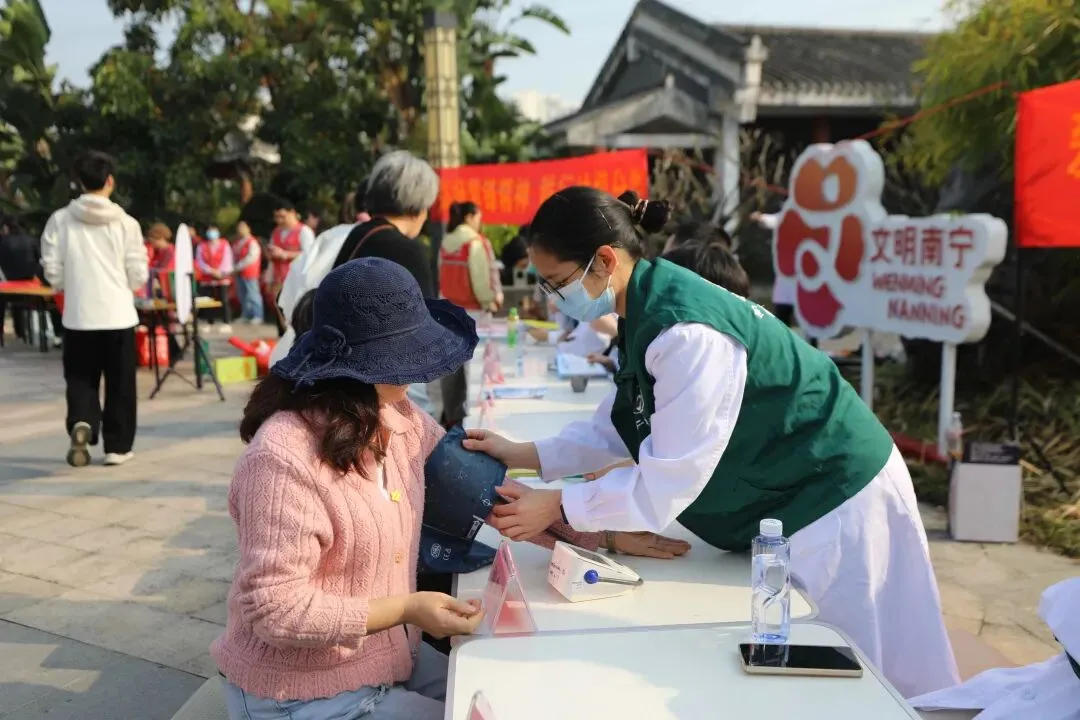 活动现场设置了学雷锋爱心义诊区。南宁市第二人民医院抽调多学科医护人员组成专业团队,为群众提供量血压、测血糖服务,耐心解答常见慢性病的防治咨询,并针对居民的健康状况给出指导建议。