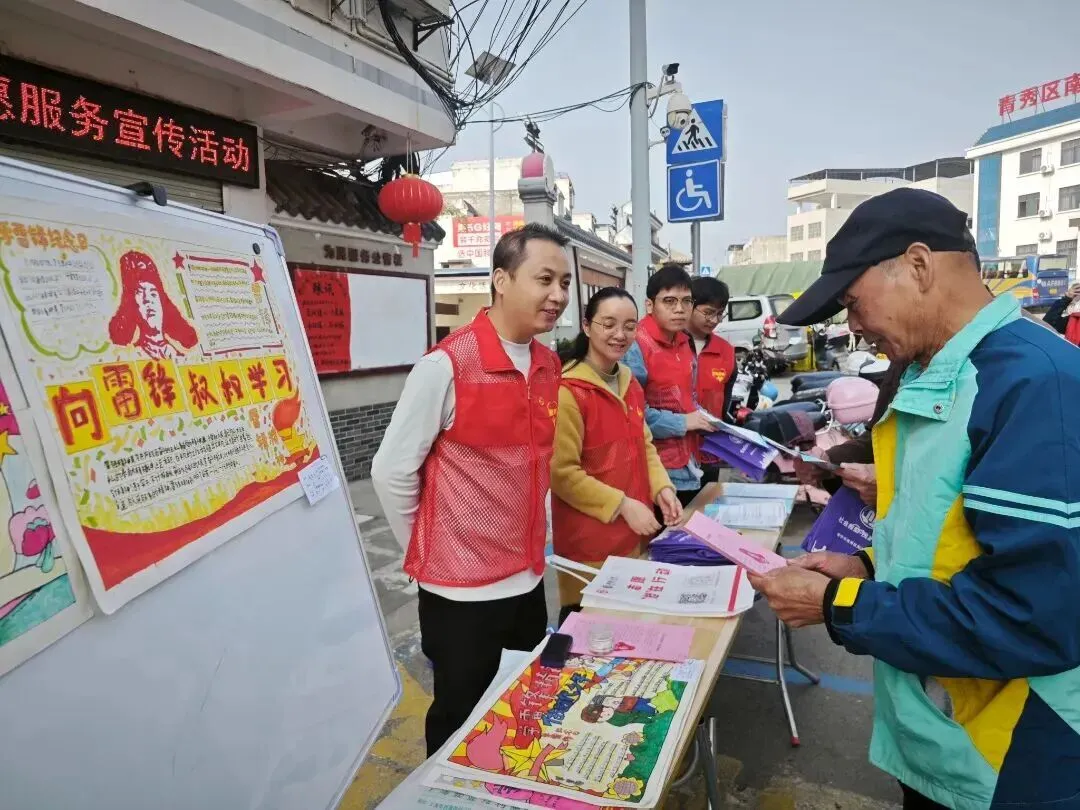 青秀区南阳镇新时代文明实践所利用圩日群众集中赶集的契机,在镇区中心开展学雷锋志愿服务主题宣传活动。志愿者通过发放宣传资料、展示学生学雷锋手抄报等方式,向群众讲述雷锋先进事迹,宣传雷锋精神的时代内涵,引导群众自觉学习雷锋精神、积极参与志愿服务。