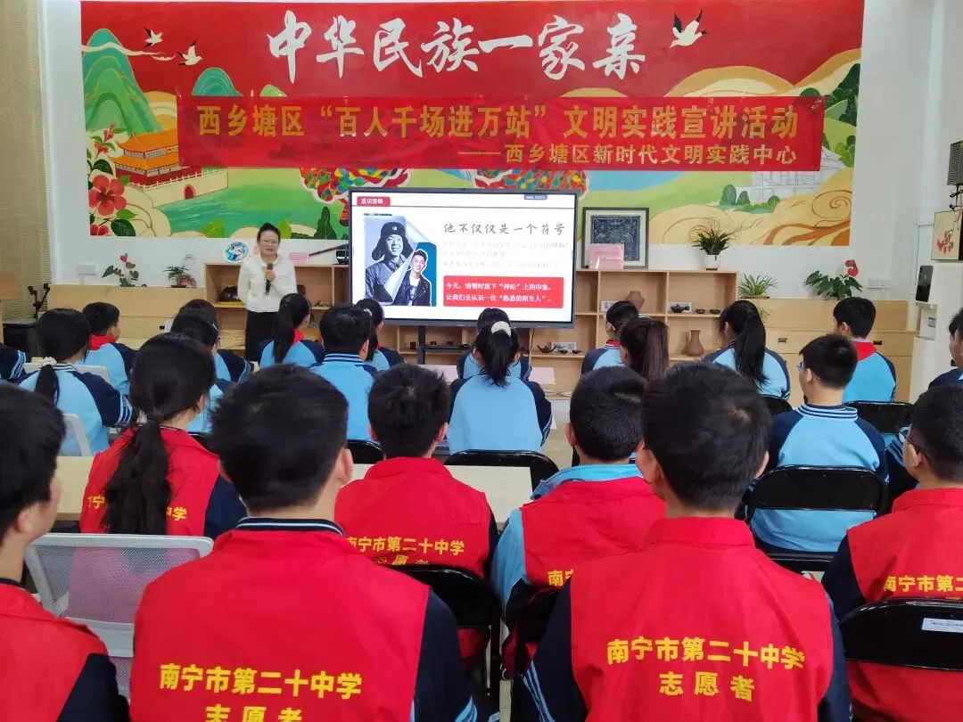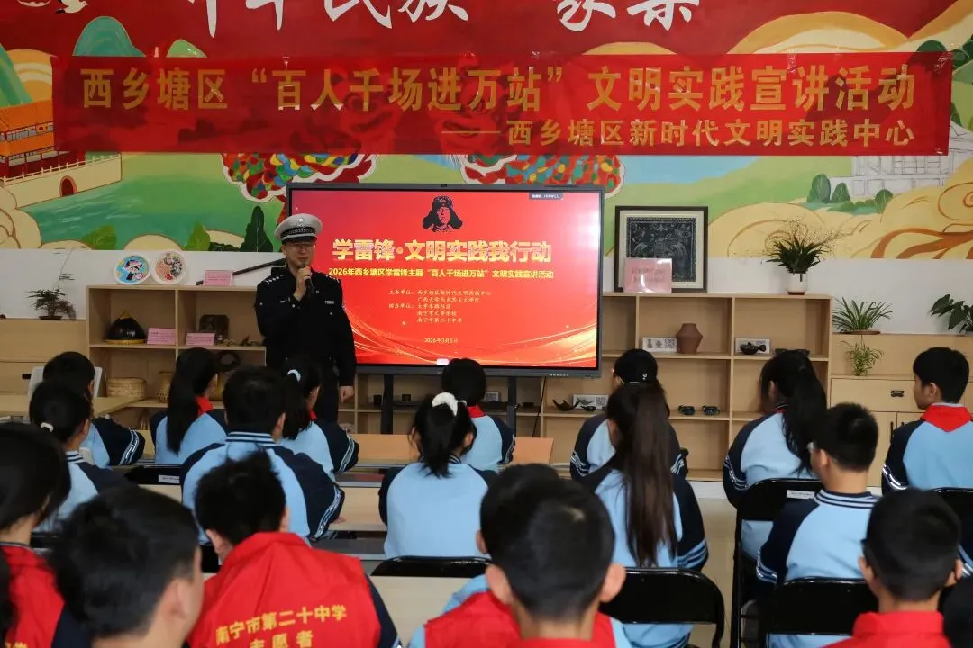 3月5日,西乡塘区新时代文明实践中心联合广西大学马克思主义学院在大学东路社区党群服务中心开展“学雷锋・文明实践我行动”主题活动。南宁交警一大队、大学东路社区、南宁市文华学校、南宁市第二十中学等单位相关负责人、师生代表及辖区志愿者代表共同参与活动,以“百人千场进万站”宣讲传精神,以学习雷锋好榜样实践证初心。
