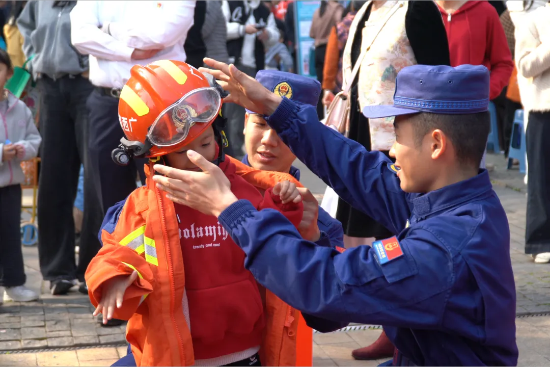 在实操体验区,江南区消防救援局开展了生动实用的消防安全知识教学。消防员讲解了常见火灾的预防与应对措施,并进行消防装备试穿、灭火器操作使用、快速打绳结逃生自救技能等一系列互动体验教学。通过模拟真实场景,市民在实践中掌握关键的消防安全技能,有效提升公众应急自救与互救能力。