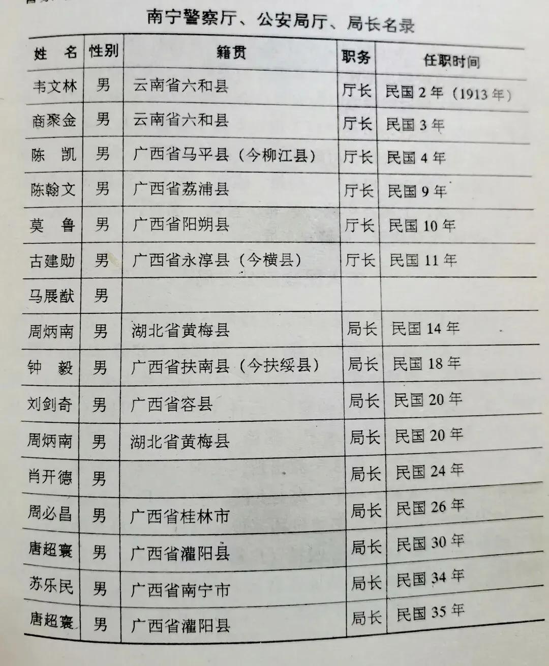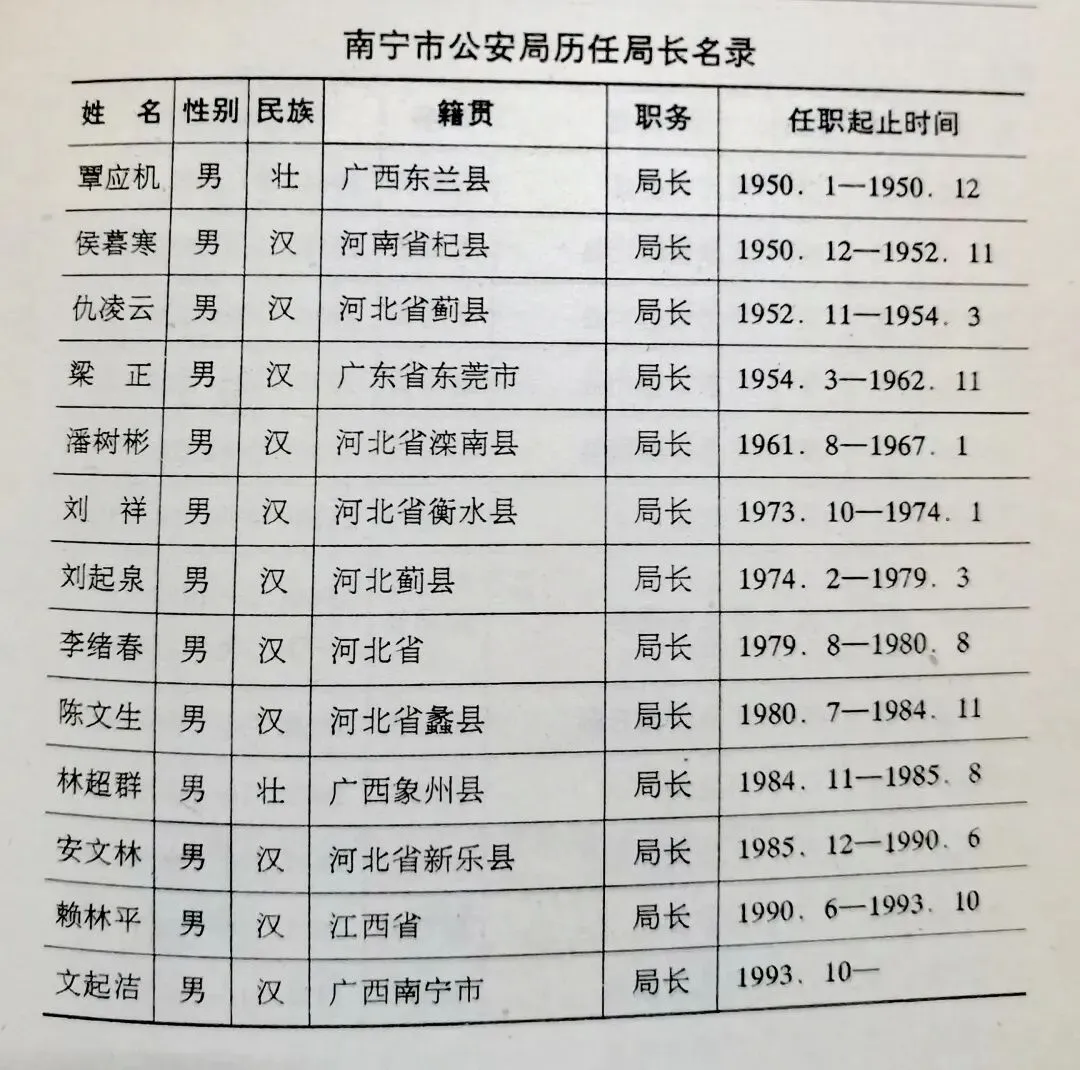 看20世纪南宁市(含民国时期)警察机构主要负责人的名录,横跨近代至现代,80年呈现出鲜明的时间纵深感与地域特色。