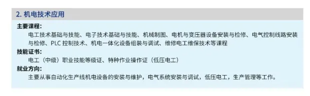 电工技术基础与技能、电子技术基础与技能、机械制图、电机与变压器设备安装与检修、电气控制线路安装与检修、PLC控制技术、机电一体化设备组装与调试、维修电工维保技术等课程技能证书: