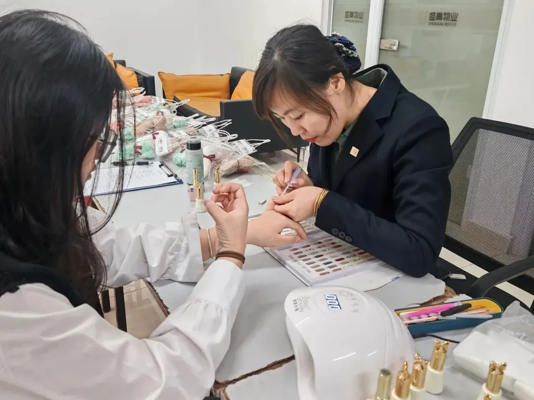 谁说美好不能十指紧扣?美甲体验区里,色彩正好,心情也正好。盛高物业化身“美丽使者”,从养护到上色,一步步将春日的温柔点缀于指尖。姐妹们围坐一起,边美甲边唠嗑,笑语间流淌着邻里的亲昵。当精致的色彩在指尖绽放,抬手轻轻端详——没错,今天,你就是最耀眼的女神。