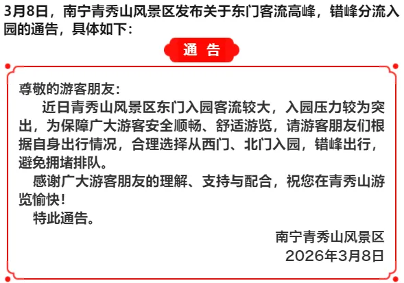南宁青秀山风景区发布关于东门客流高峰,错峰分流入园的通告