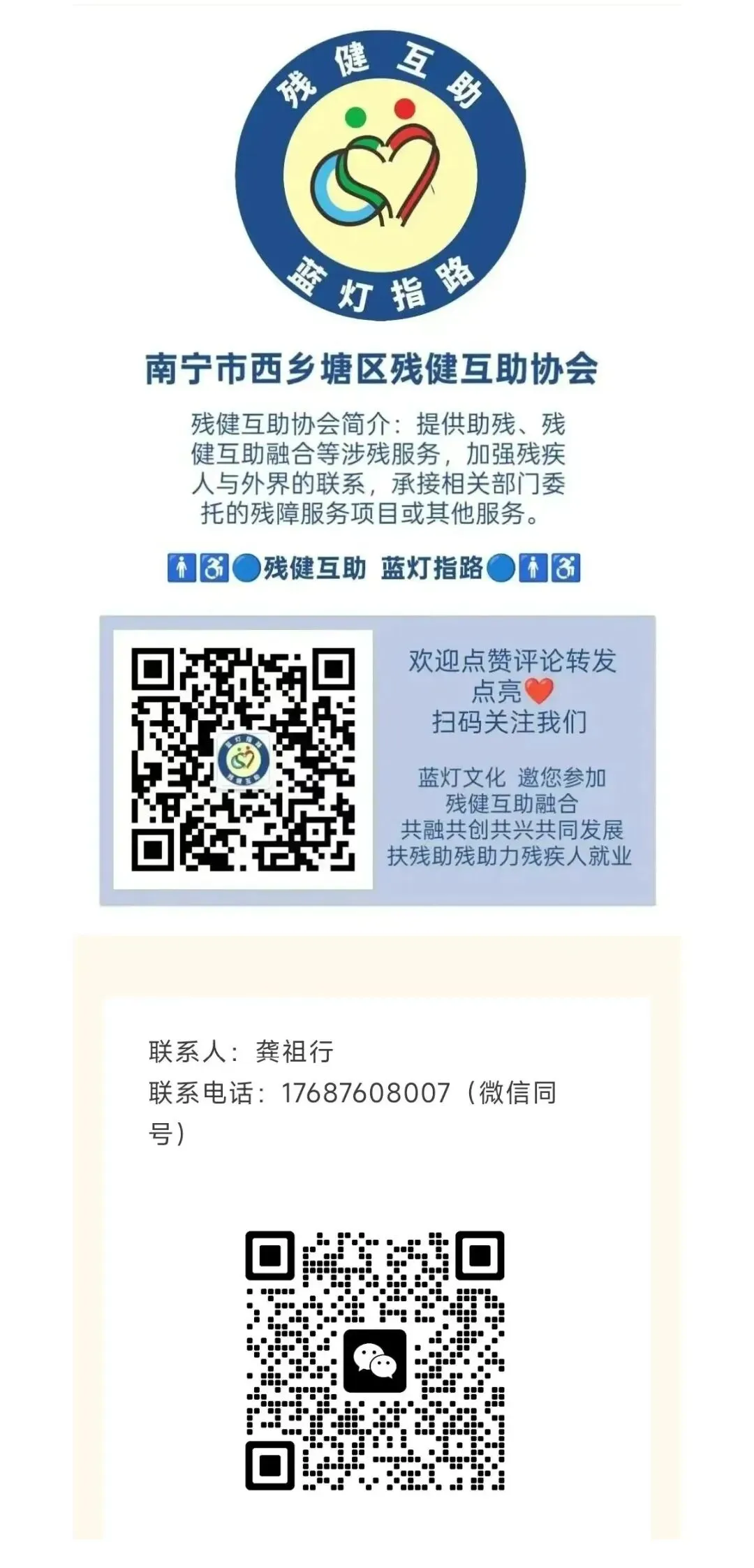 南宁市西乡塘区残健互助协会在此呼吁:欢迎广大爱心企业、爱心人士加入我们,携手汇聚爱心、共享资源、共筑大爱,以微光聚星河,以行动践初心,为残疾人朋友撑起更加宽广明亮的天空,共同书写新时代残健共融的美好篇章!