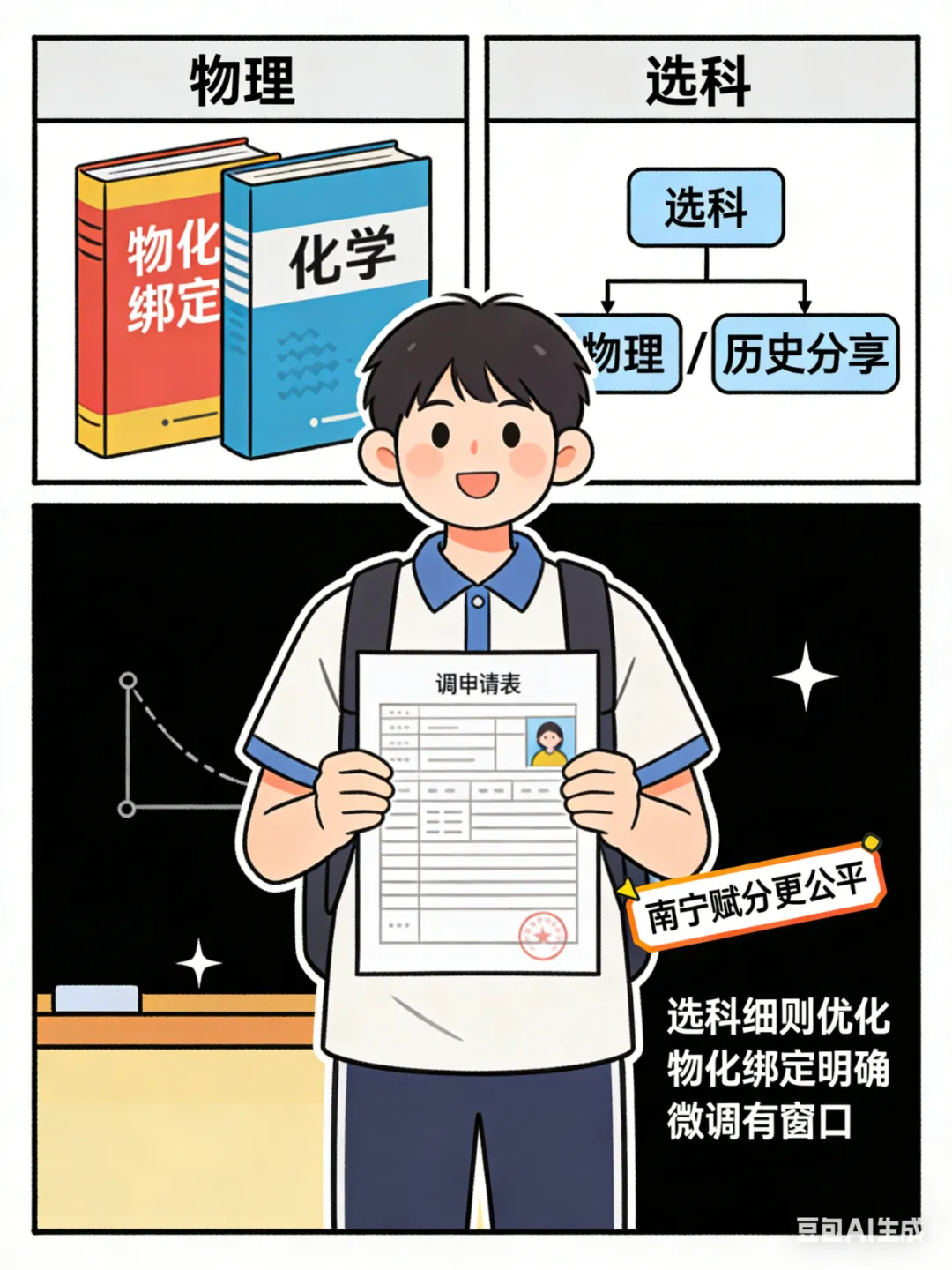 ✅ 选科核验更灵活:高一上学期末完成选科确认,允许高一下学期开学 1 个月内微调,避免学生因初期适应不佳选错科目,南宁各高中已同步落实 “选科微调通道”;