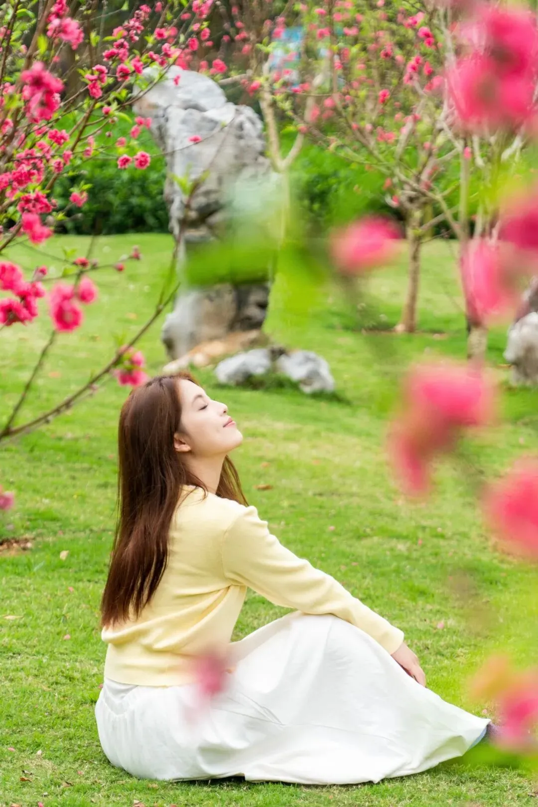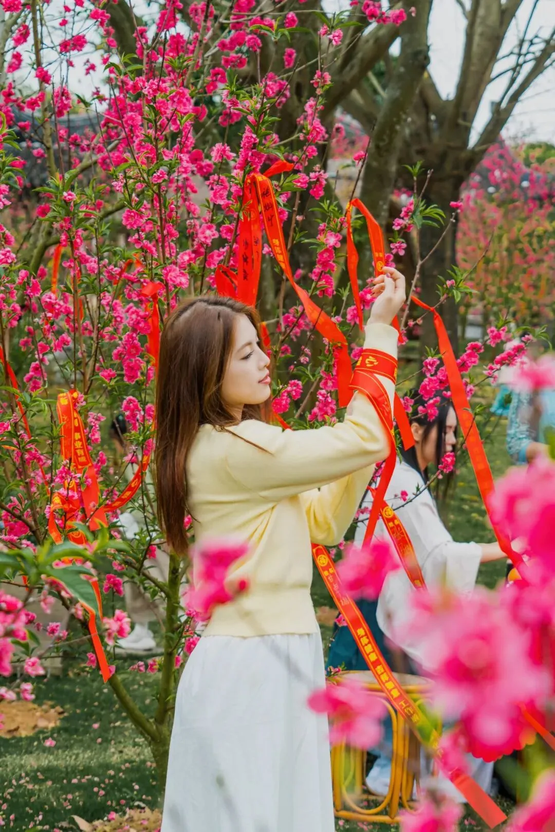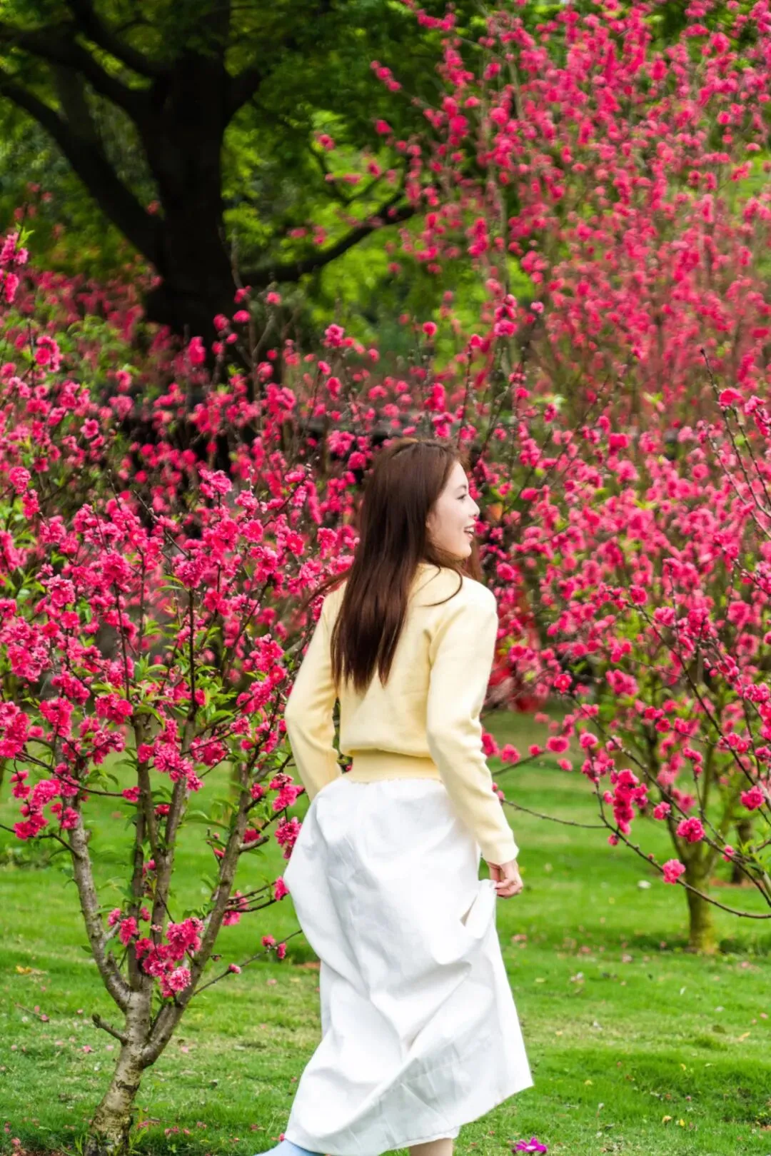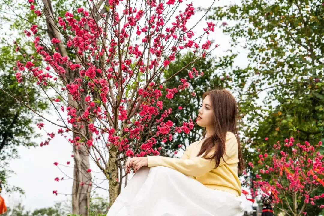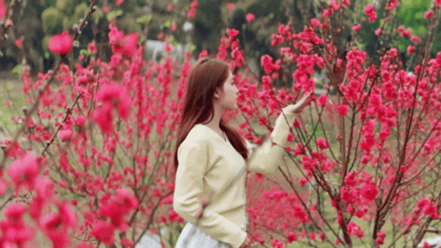 穿行于嫣红嫩色的桃花之间