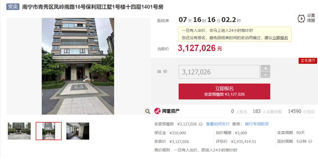 这次又是豪宅拍卖,不过不是别墅,而是大平层,具体点是南宁市青秀区凤岭南路16号保利冠江墅1号楼十四层1401号房。该大平层的建筑面积是258.09㎡,套内面积是207.87㎡,目前没能看到相关屋内照片,但依据这个面积,一般会是5-6室配3-4个卫生间。这个位置可以看到270° 江景以及青秀山视野,属于是顶豪大平层的配置,这个地段在南宁夜市顶级地段梯队,是公认的 “山、江、城、园” 四合一稀缺核心区。在这个小区,周边配套自然不用说了,出行便利,公交的话附近有多个站点,地铁离得远了点,自驾会更加方便。教育资源覆盖幼儿园到初中,都是较好的校区哦,像幼儿园有广西幼儿师范高等专科学校实验幼儿园、稚慧保郡幼儿园等,小学可以有民主路小学青环路校区,民主路小学凤岭南校区选择。南宁三中初中部以及青秀区凤岭南路中学也在附近,教育资源较为优质。商业购物成熟,楼下就是广百汇超市、邻里天街,大型商场比如万达茂,龙湖青秀天街等,买菜也方便,不远处有个林里桥农贸市场。地段非常不错,当然了价格也贵,这里的二手均价大概在2万多,像这套房子的话,哪怕是清水房也至少要四五百万。在拍卖页面显示的评估价是293.5万,但是起拍价却要312.7万,这个起拍价高于评估价也是罕见,也说明了这个房子着实不错。可惜啊,前两次拍卖都流拍了,无人报名无人出价,一般二拍的起拍价都会有所下降,但是这套房子价格坚挺,不管是二拍还是变卖,起始价都是312.7万。另外这套房子还有个问题,就是目前有人居住,没有腾空,大概率也没有签腾空承诺书,后续可能需要法院强制腾空。因为没有更多其他信息,所以如果有意向参与竞拍的,需提前去往该房屋实地查看,了解一下房子布局以及装修如何,以及一梯几户,还有物业费收费标准等。这次变卖距离结束还有7天左右的时间,虽然有不少人围观,但至今无人报名,更无人出价,看来大家都还在观望,或者纯粹来看热闹。