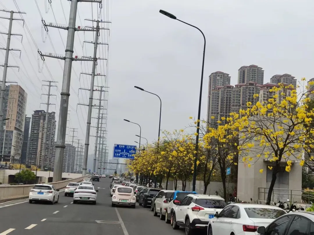 这里是南宁市良庆区平乐大道,从南宁市区出发往那马方向,过了南宁大桥,盛开的黄花风铃木就出现在您眼前。
