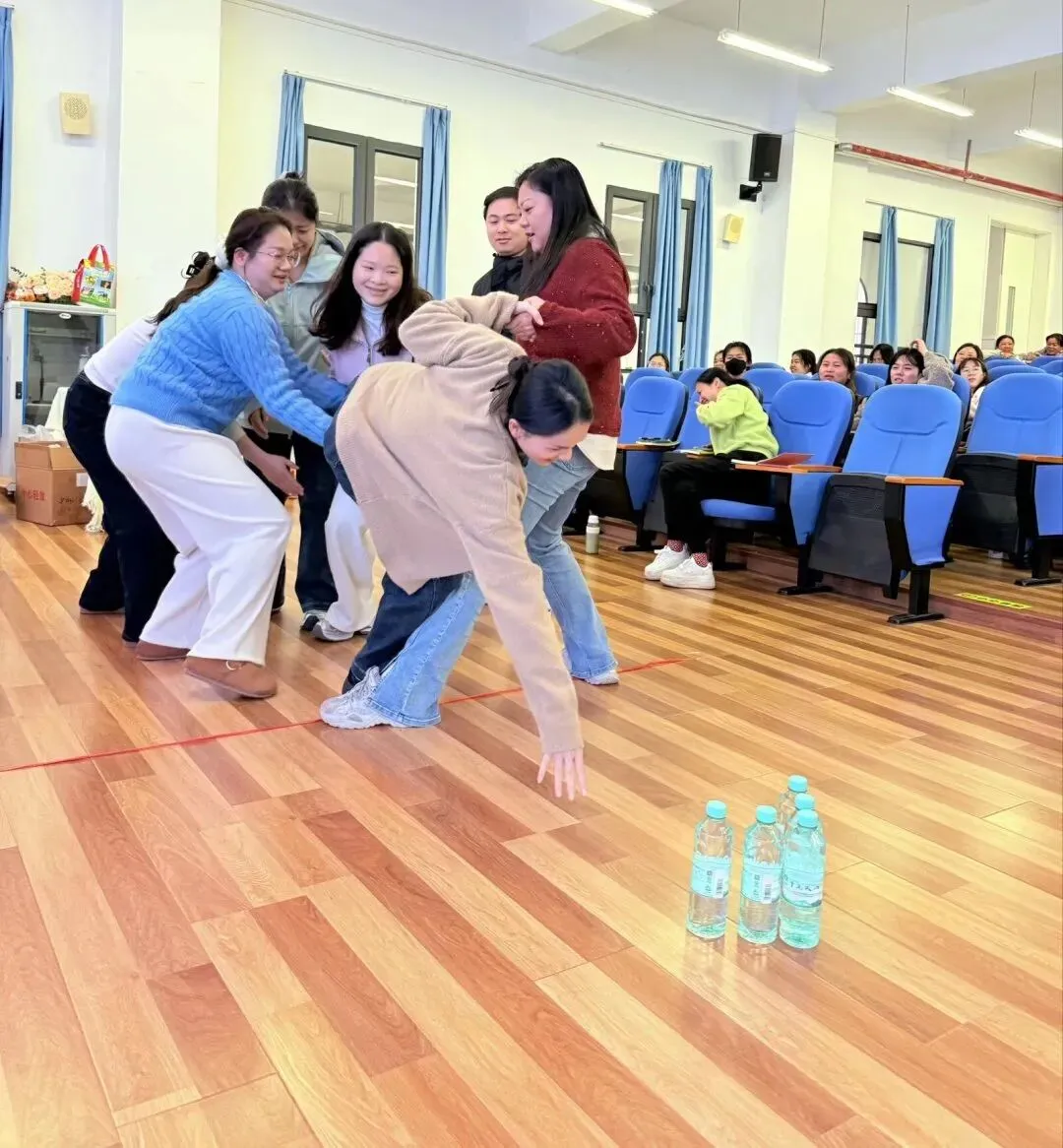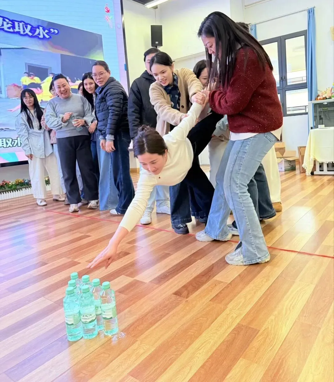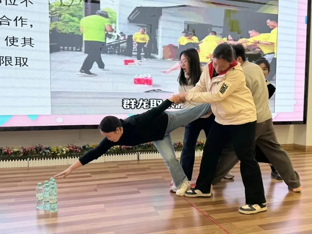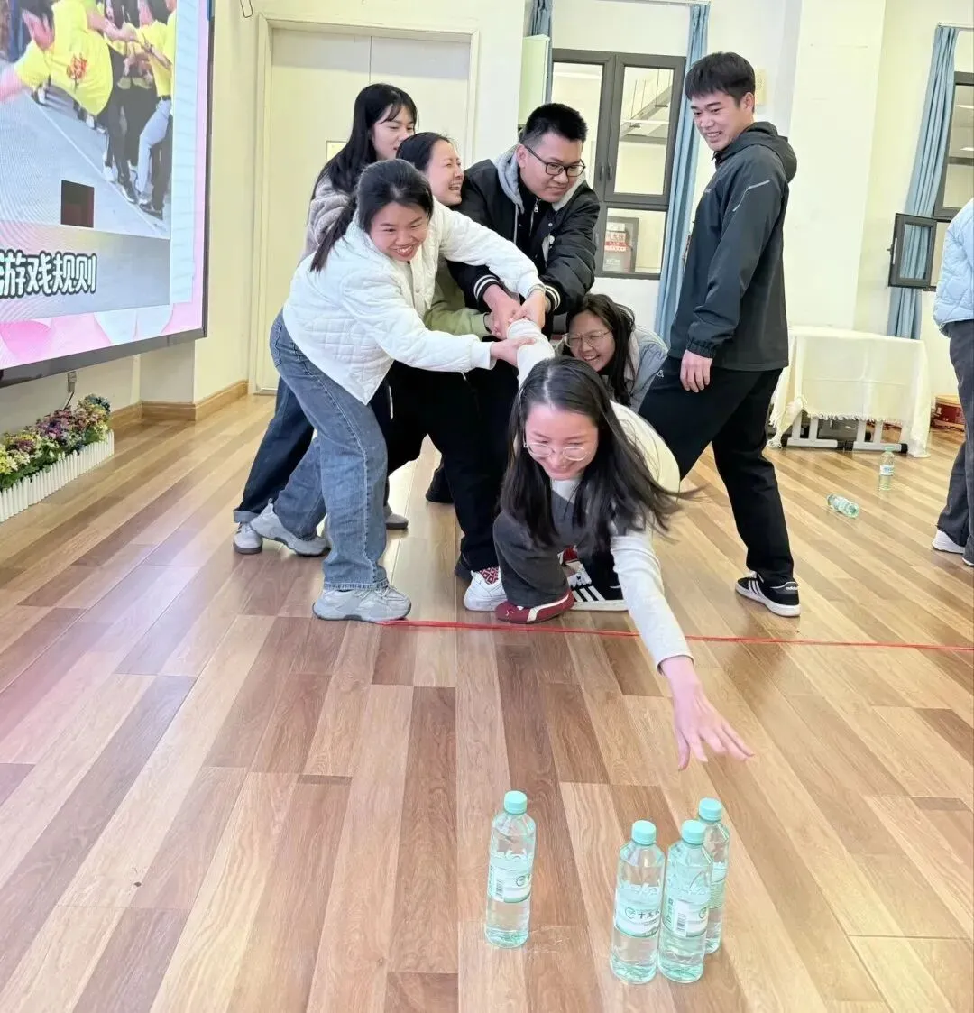 轻松愉悦的氛围中,“群龙取水”团队游戏率先登场。老师们化身默契搭档,在界限外巧妙配合、悬空探身,齐心协力完成取水任务。展现出玉雅教职工团结友爱、奋勇争先的精神风貌。