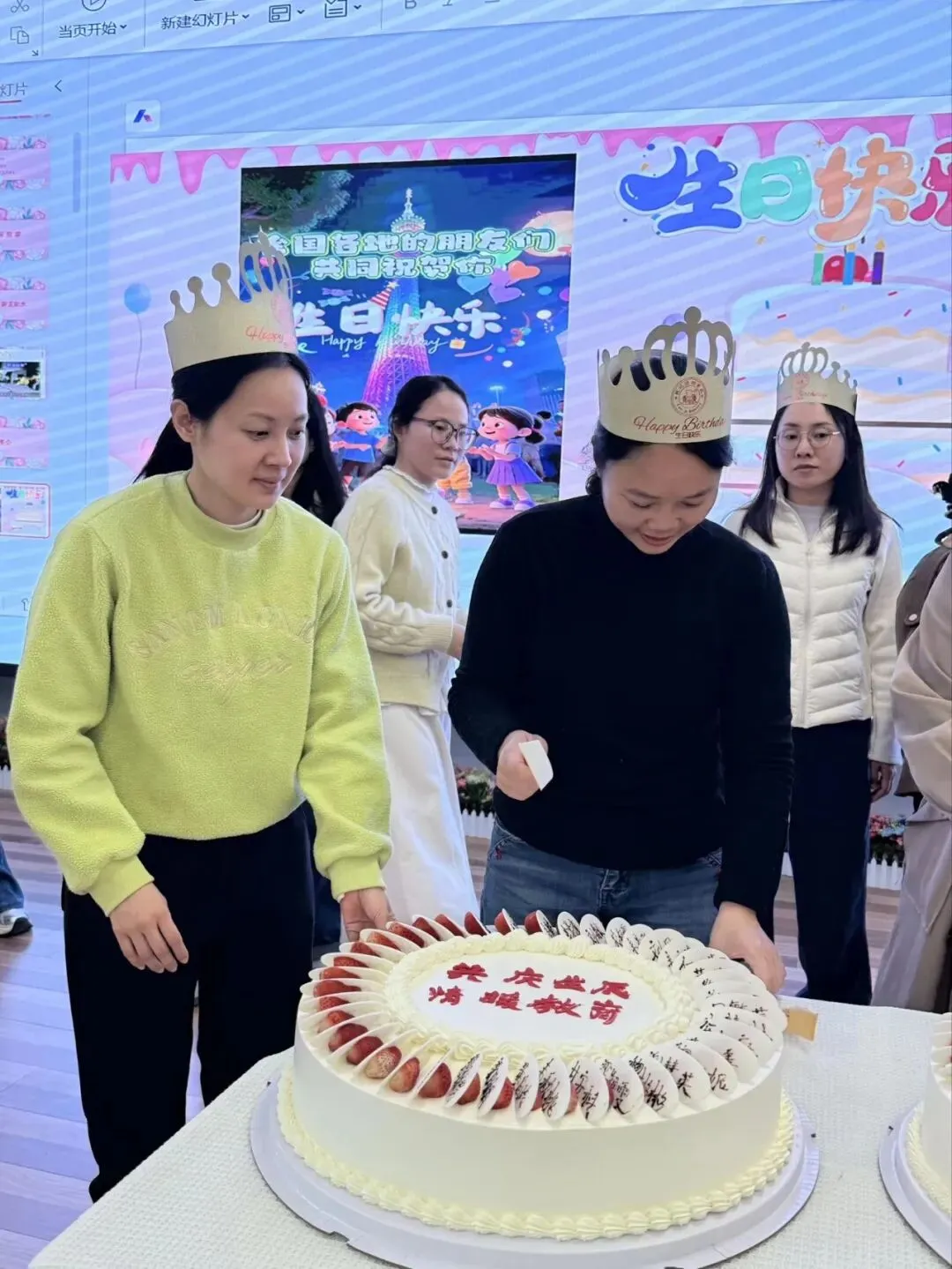 活动最温暖的环节,当属集体生日会。工会委员邀请第一季度和第四季度生日的教职工上台,戴上生日帽,全场齐唱生日歌,送上真挚祝福。在温馨的歌声中,“寿星”们共同切下象征甜蜜与美好的蛋糕,与大家分享这份专属的幸福与感动。