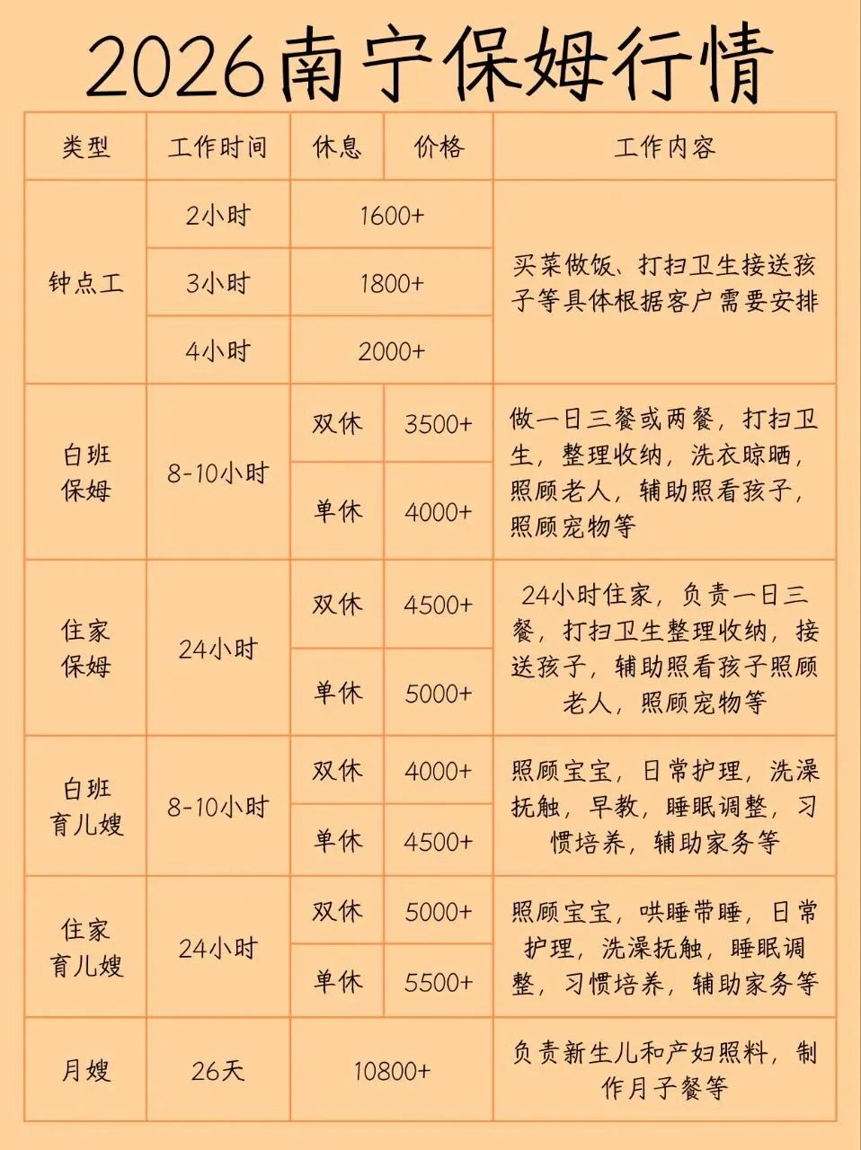 坐标南宁,精心为大家整理出这份保姆阿姨市场价格表,仅供参考! 涵盖钟点工、白班阿姨、住家保姆、白班育儿嫂、住家育儿嫂、护工、月嫂等各类家政服务人员。 希望这份价格表能帮助到想找阿姨的姐妹,如果有想了解更多阿姨信息的姐妹可滴滴~