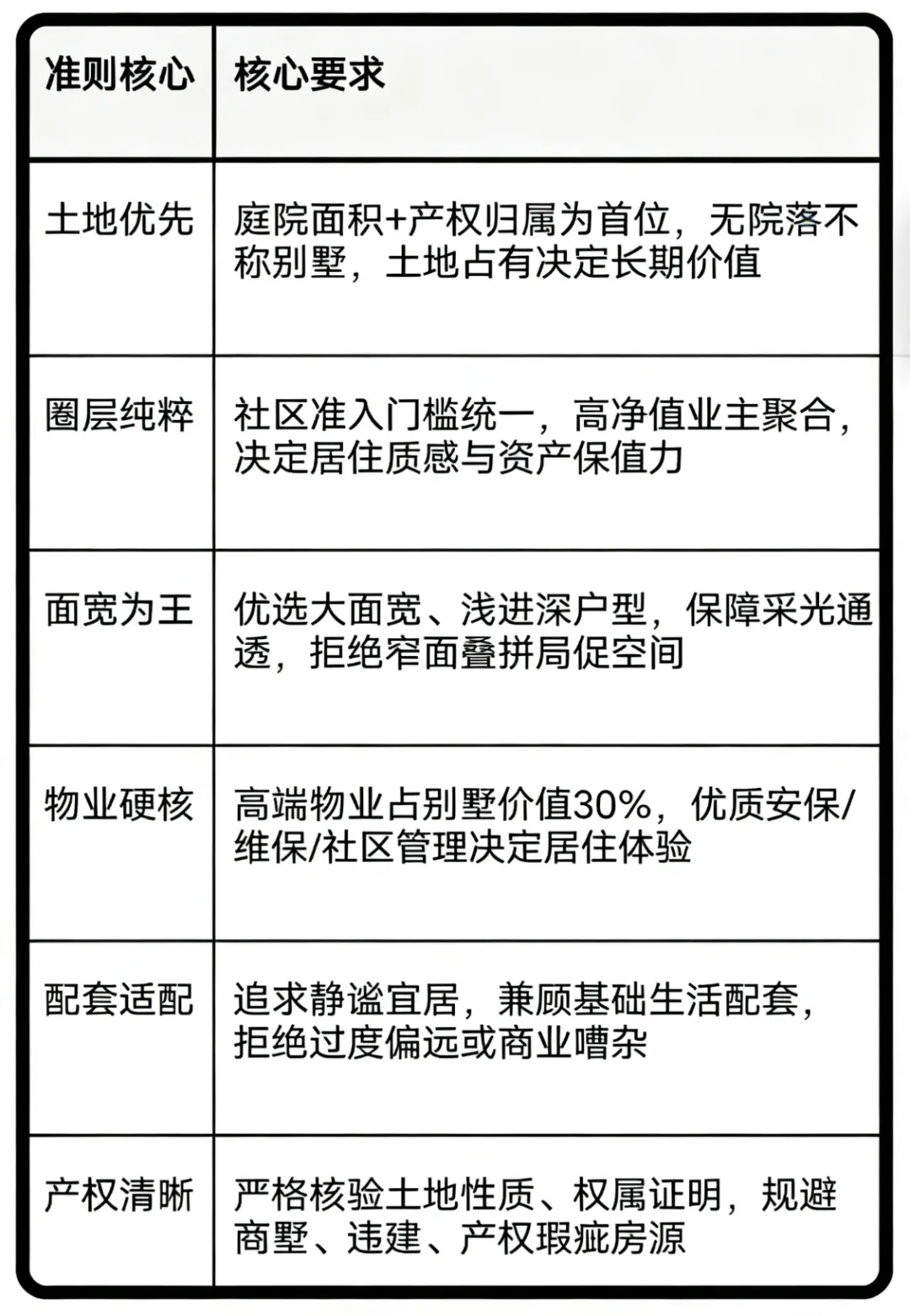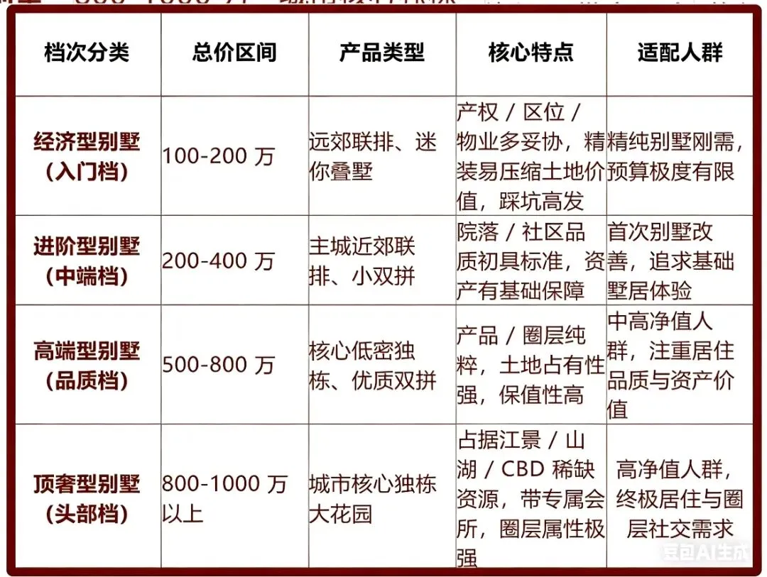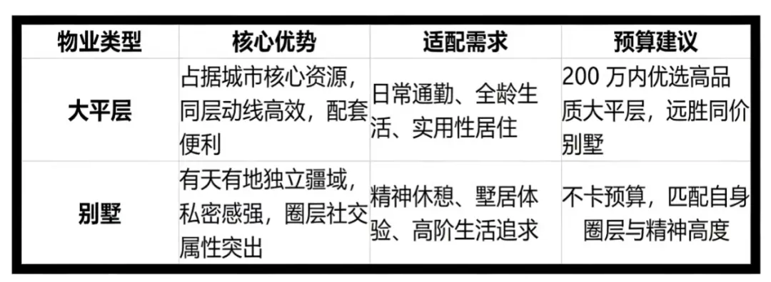 - 居住逻辑错位:就是拿刚需思维去买改善盘,错穿鞋子!因为刚需以 “落脚、通勤” 为核心,有房即优选;而别墅是终极改善资产,承载圈层、私密与精神归属,卡预算购买,违背产品底层价值。