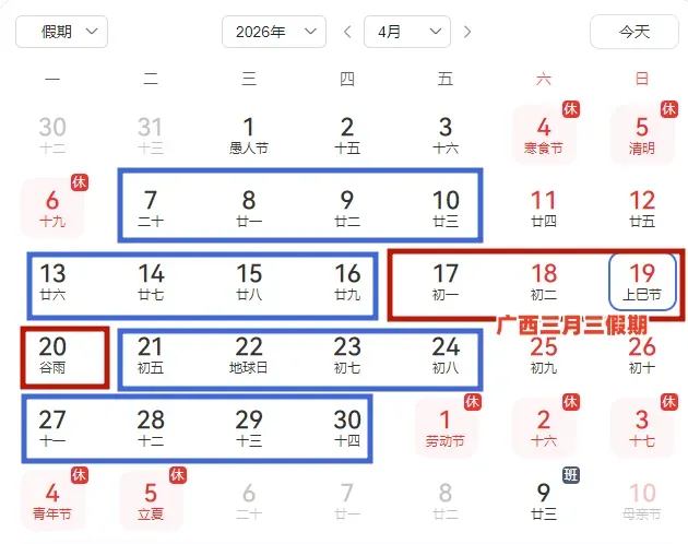 3月4日,广西官宣2026年广西三月三放假通知:4月18日(周六)、4月19日(周日)放假,4月17日(周五)、4月20日(周一)补休,共休4天。
