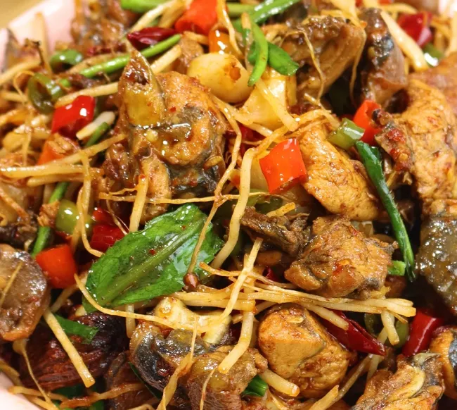 要说一款最能代表天等的味道,我会选指天椒炒土鸡。做法不复杂,鸡块先用姜蒜和少量米酒煸到微黄,再下本地指天椒圈和酸笋同炒,最后加一点骨汤焖几分钟。重点不是猛辣,而是辣香裹着鸡油,入口先热后甜,越吃越顺。