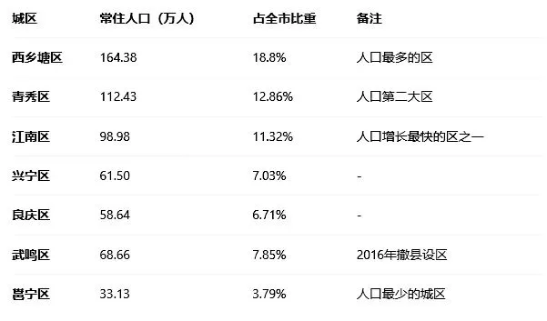根据2020年第七次全国人口普查数据,南宁市7个城区常住人口合计597.72万人。各城区人口分布特色鲜明,勾勒出这座城市的发展格局。