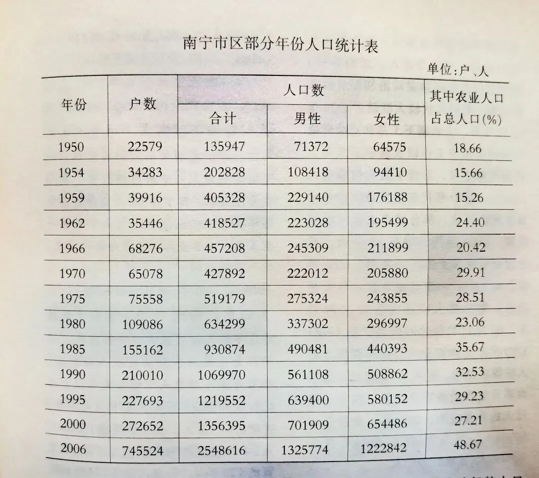 (2020年七普南宁市城区人口)西乡塘区以164.38万人位居榜首,占全市人口18.8%,是南宁人口最多的城区,活力十足。青秀区以112.43万人紧随其后,作为第二大区,集聚了众多城市核心功能。江南区常住人口98.98万人,是人口增长最快的区之一。如果我们将目光拉长,南宁的城市扩容步伐坚定。1950年,城区人口仅13.59万;到了2006年,这个数字已跃升至254.86万。半个多世纪里,城市人口增长了近18倍。尤其值得注意的是2000年后,城市化进程明显加快,农业人口占比在2006年达到48.67%,意味着近半常住人口来自乡村,他们正是城市发展的建设者和新市民。从1950年的13万人到2020年的近600万人,南宁用七十年时间,完成了从边陲小城到区域中心城市的华丽转身。