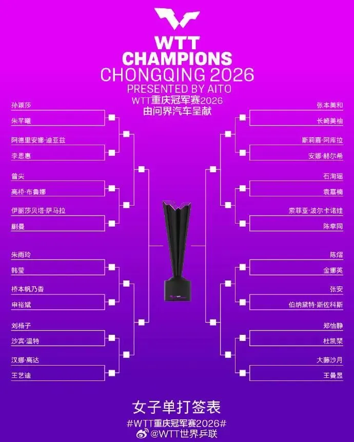WTT重庆冠军赛2026,将于3月10日至15日开赛。3月8日,男女单打签表出炉。(详情>>)
