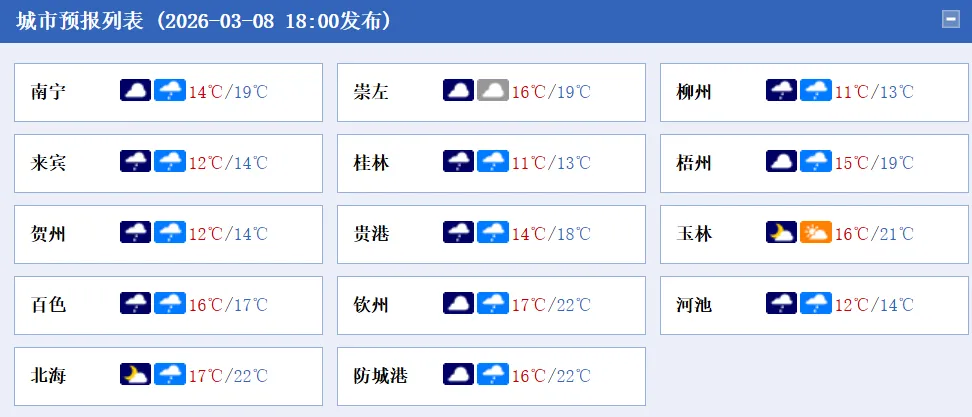 广西气象台预计,9日晚上到10日,桂北雨停转多云,桂南阴天还有些零星小雨,10日晚上到11日白天全区多云到阴天。11日冷空气影响基本结束,广西大部最高气温火速冲到23℃以上。(详情>>)