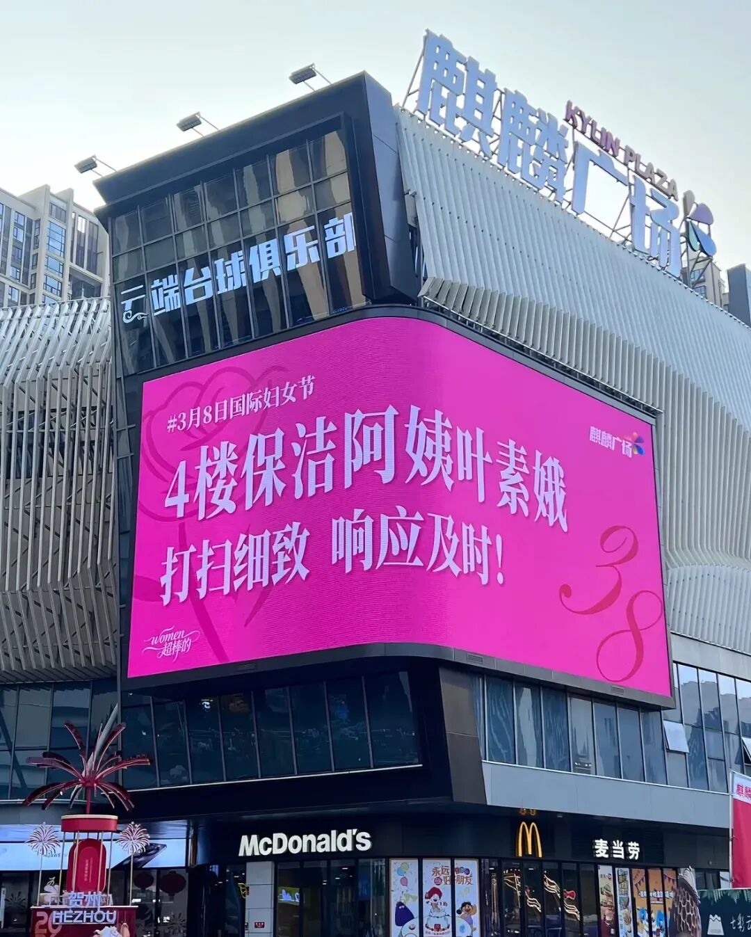 广西一商场大屏妇女节文案“点名表扬”女员工引爆赞,商场回应:她们的表现都有目共睹