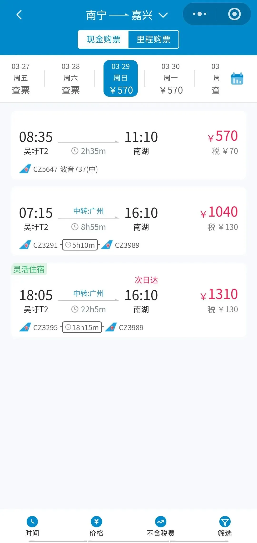12:10嘉兴南湖机场—14:50南宁吴圩国际机场